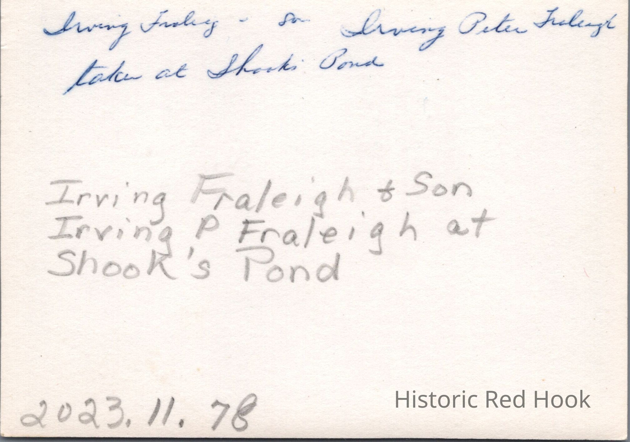 An informal photograph of Irving Fraleigh with his son Irving Peter at Hooks Pond.Photograph Details