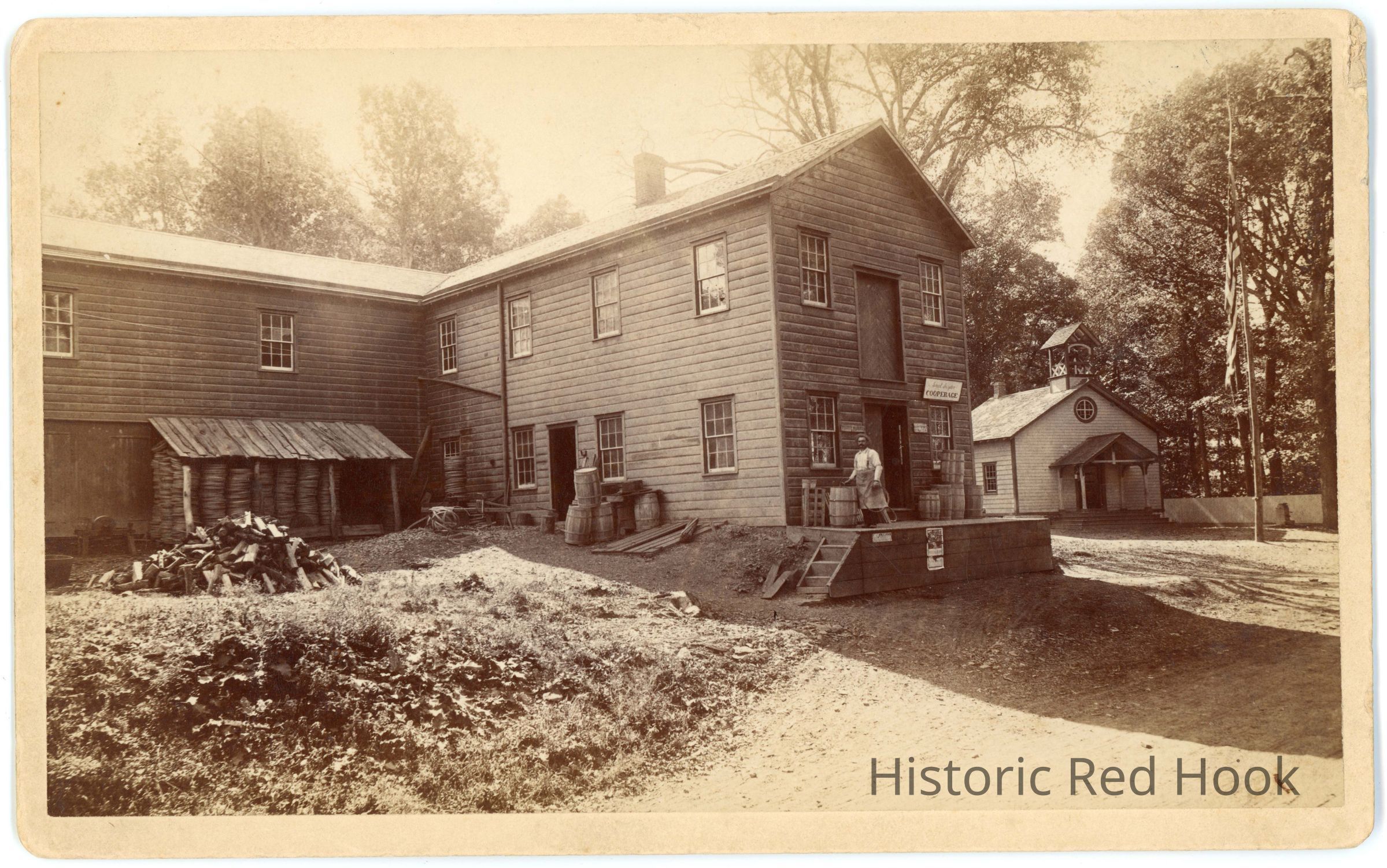 Cooper shop of Israel Snyder, Barrytown, N.Y. William Proper standing in front of shop. October 1893. Barrytown School can be seen in the background. The cooperage made and repaired wooden barrels, tubs and casks. Image used in 'A Brief History of Red Hook' p.61.Photograph Details