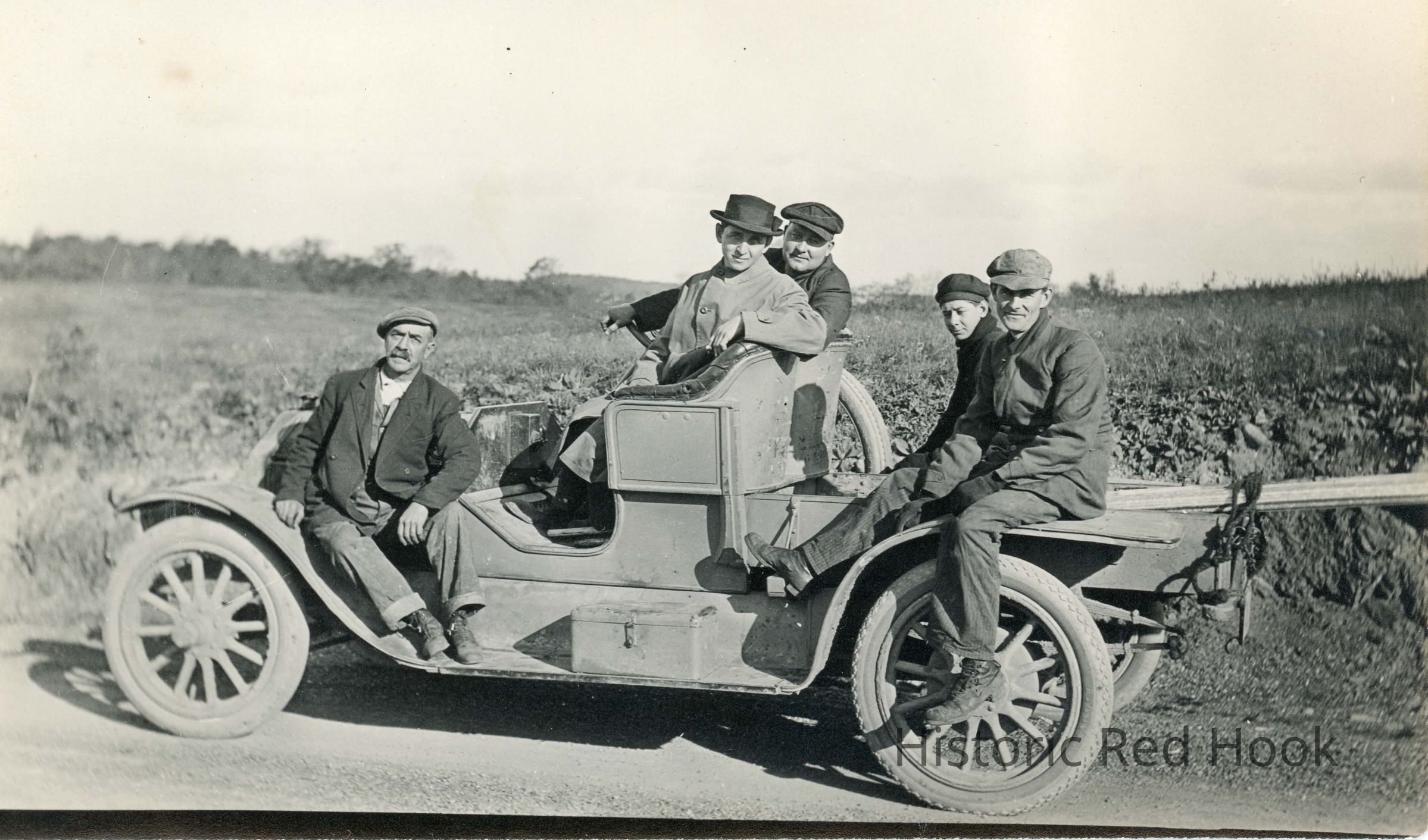 Five men on a vehicle. Written on back: "Stubbie Jewel on front fender. A.J. Thomas & Norman Moore in the seat of J.A. Curtis work truck. Do not know the two in the back"Photograph Details