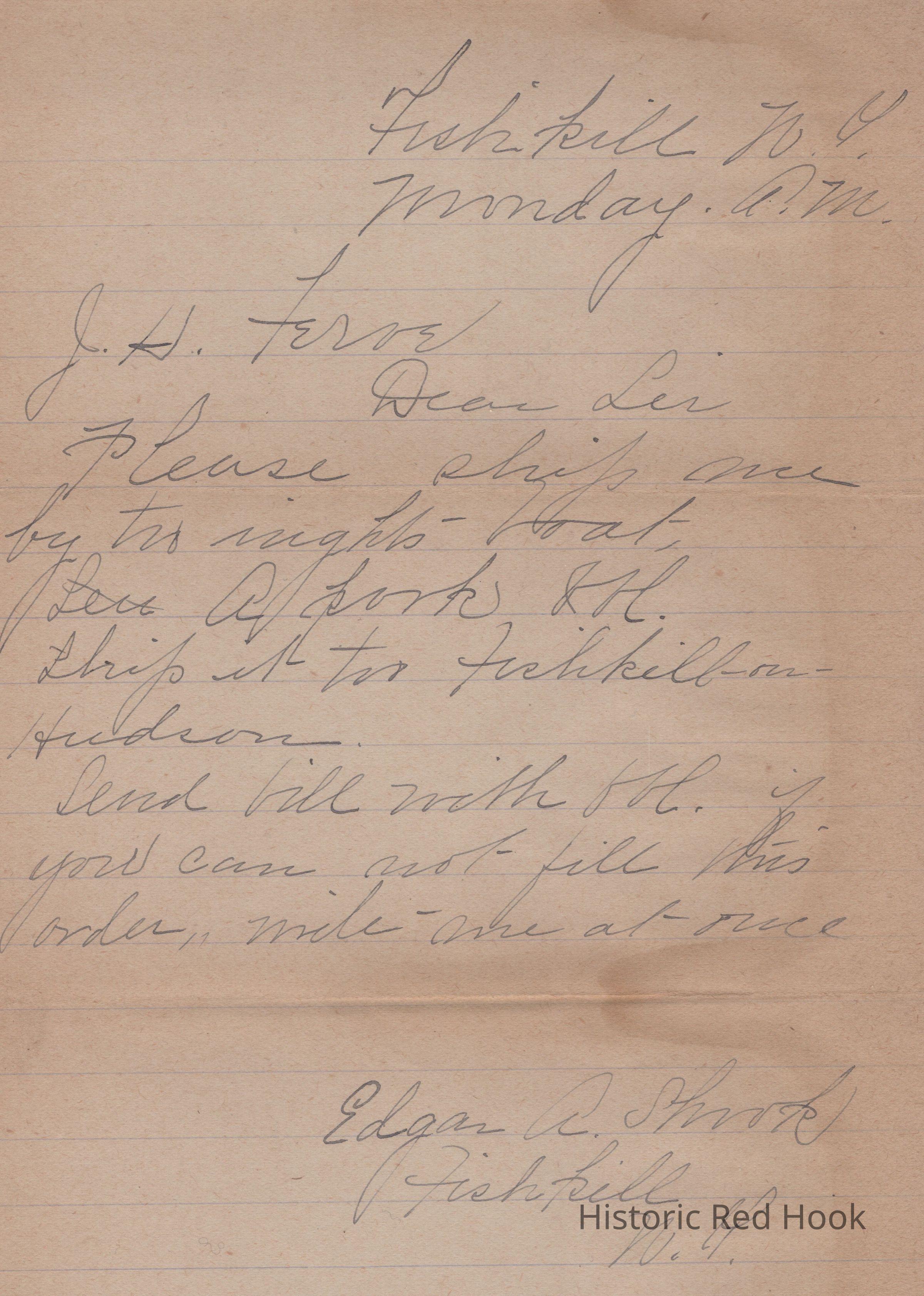 A letter addressed to J. H. Feroe requesting a shipment by boat to Fishkill dated December, 1899.Collection