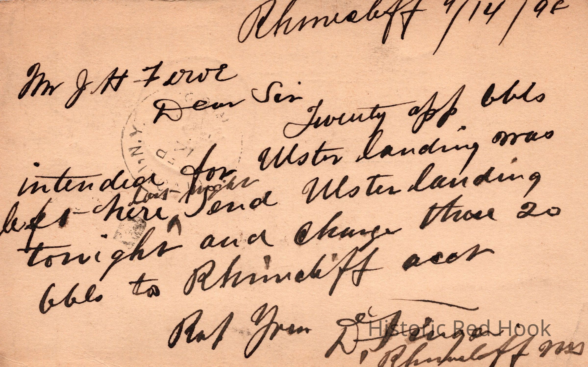 A postcard sent to Mr. J.H. Feroe, Tivoli NY, informing him that a shipment of apples had been left at Ulster Landing the previous evening and were being sent ahead that night. Postmarked Rhinecliff, NY and marked "Rush".Collection
