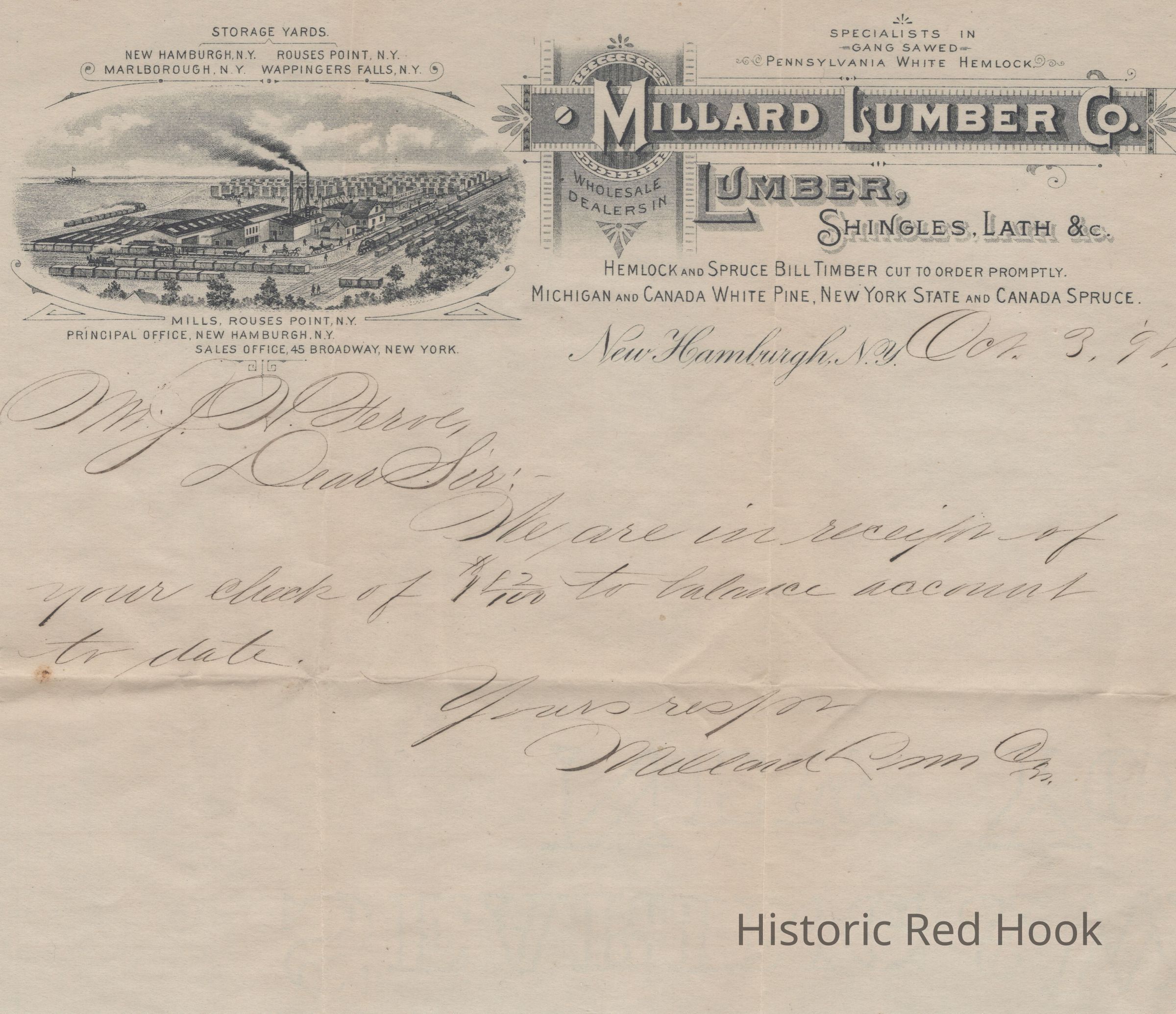 A receipt from Millard Lumber, New Hamburg, New York, dated October, 1898 acknowledging receipt of a check for the account balance of J. H. Feroe.Collection