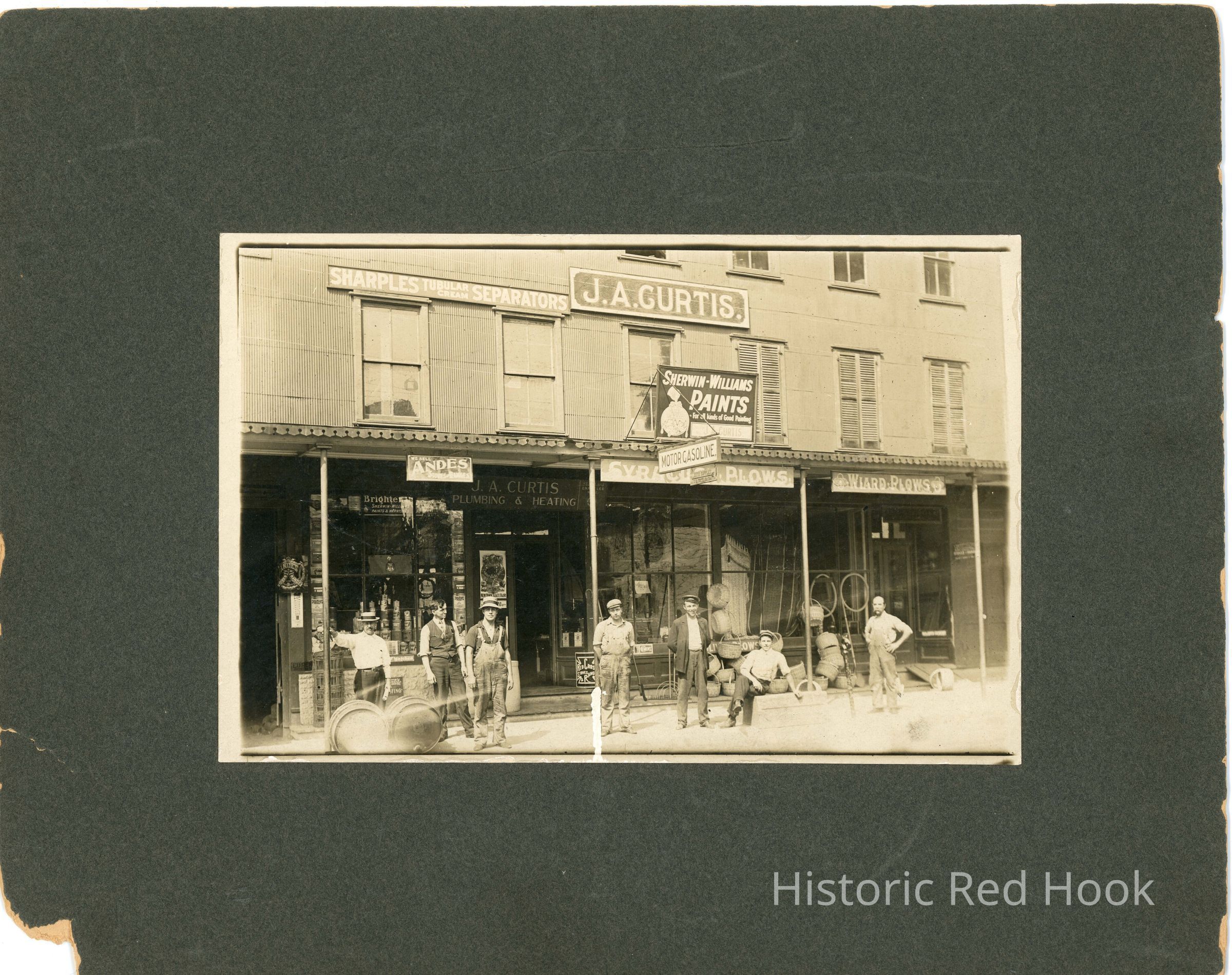J.A. Curtis Plumbing & Heating store on East Market Street. The upper floors are covered in corrugated metal. Several men wearing hats are standing in front of the store. Early 20th c.
