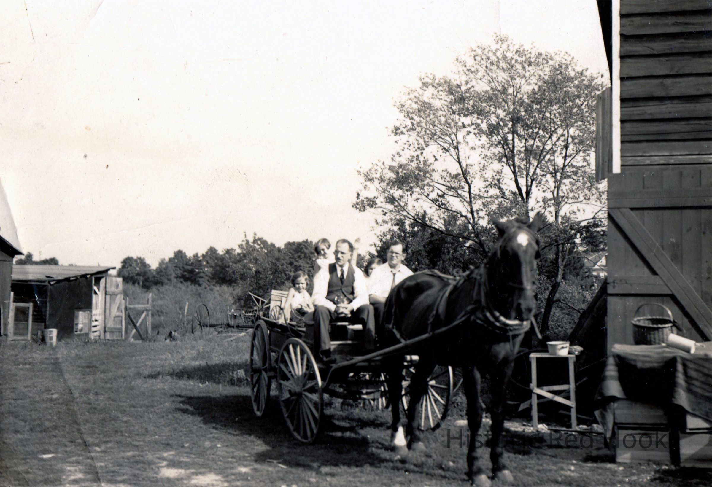 The O'Neill family rides in a horse-drawn carriage by a wooden barn in daylight.