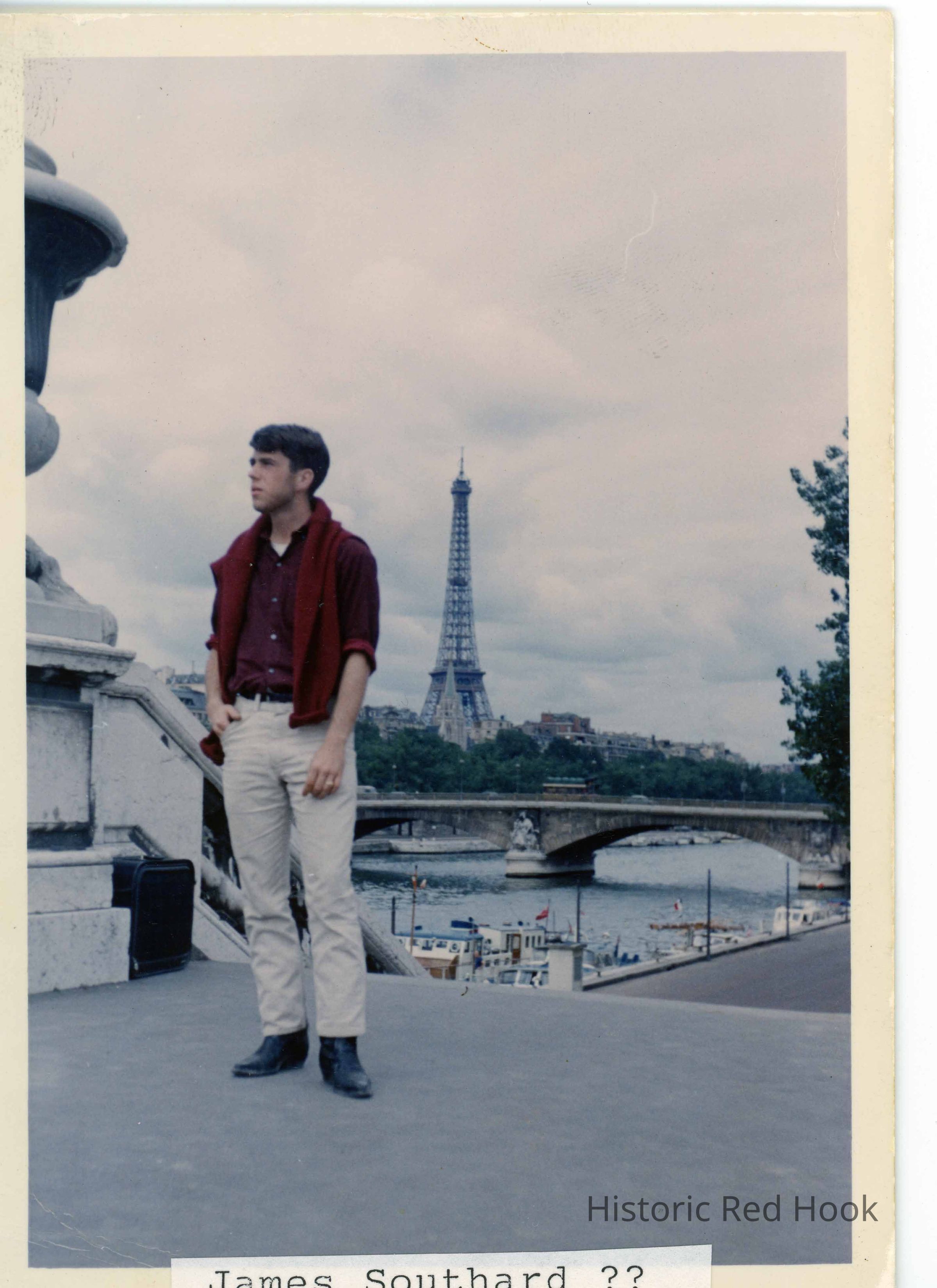 A young man identified as possibly James Southard pictured standing at the top of an outdoor staircase with a tower and bridge in the backgroundPhotograph Details