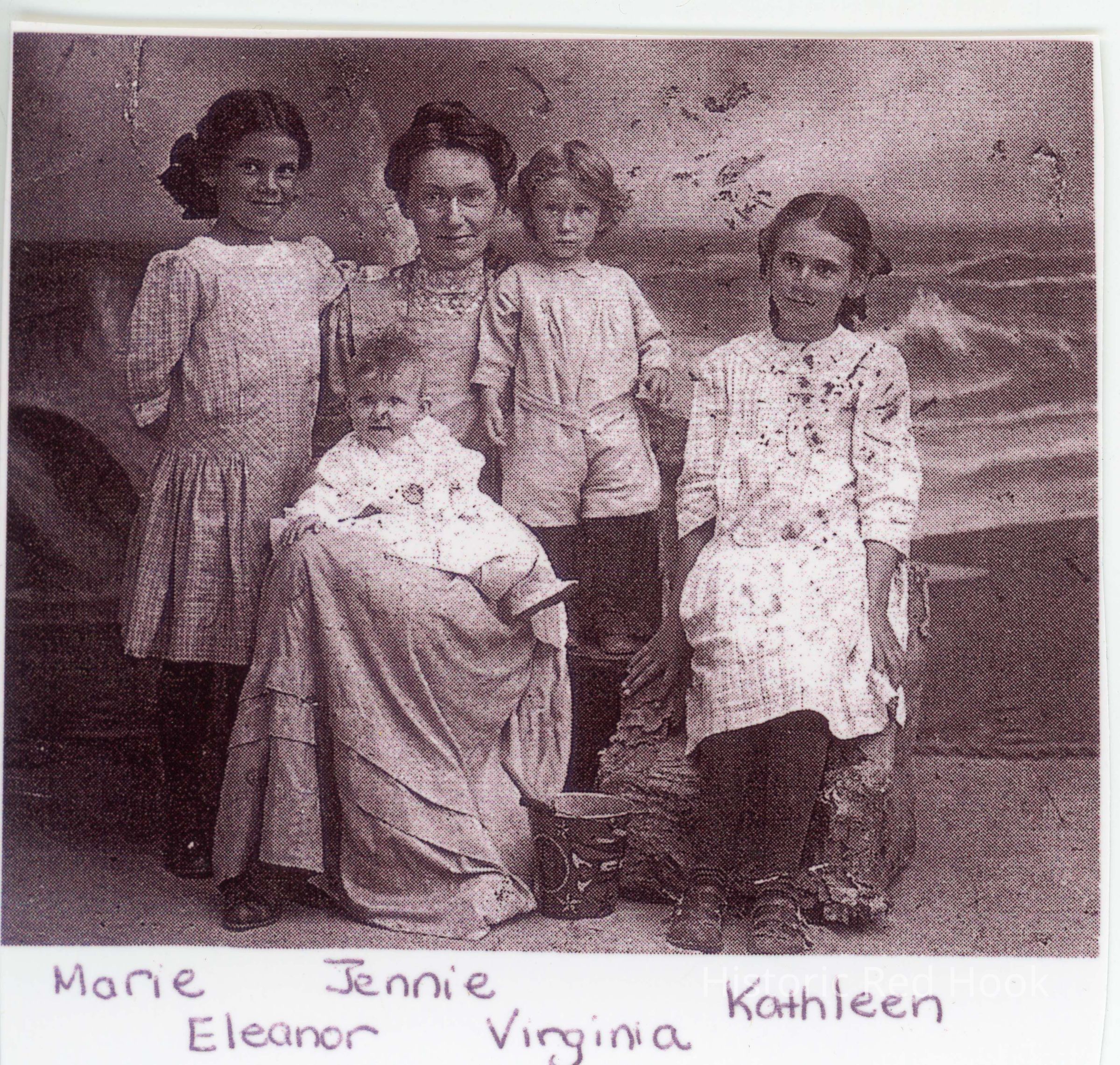 Black and white photograph of a Jennie Griffing with four Griffing daughters, Virginia and Eleanor, and step-sisters Marie and Kathleen (Emma's daughters).Photograph Details