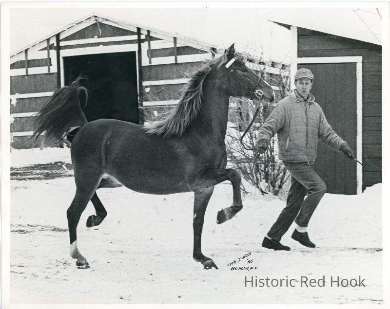 Joe Alloy with trotting horse on his horse farm on Echo Valley Road, 1966