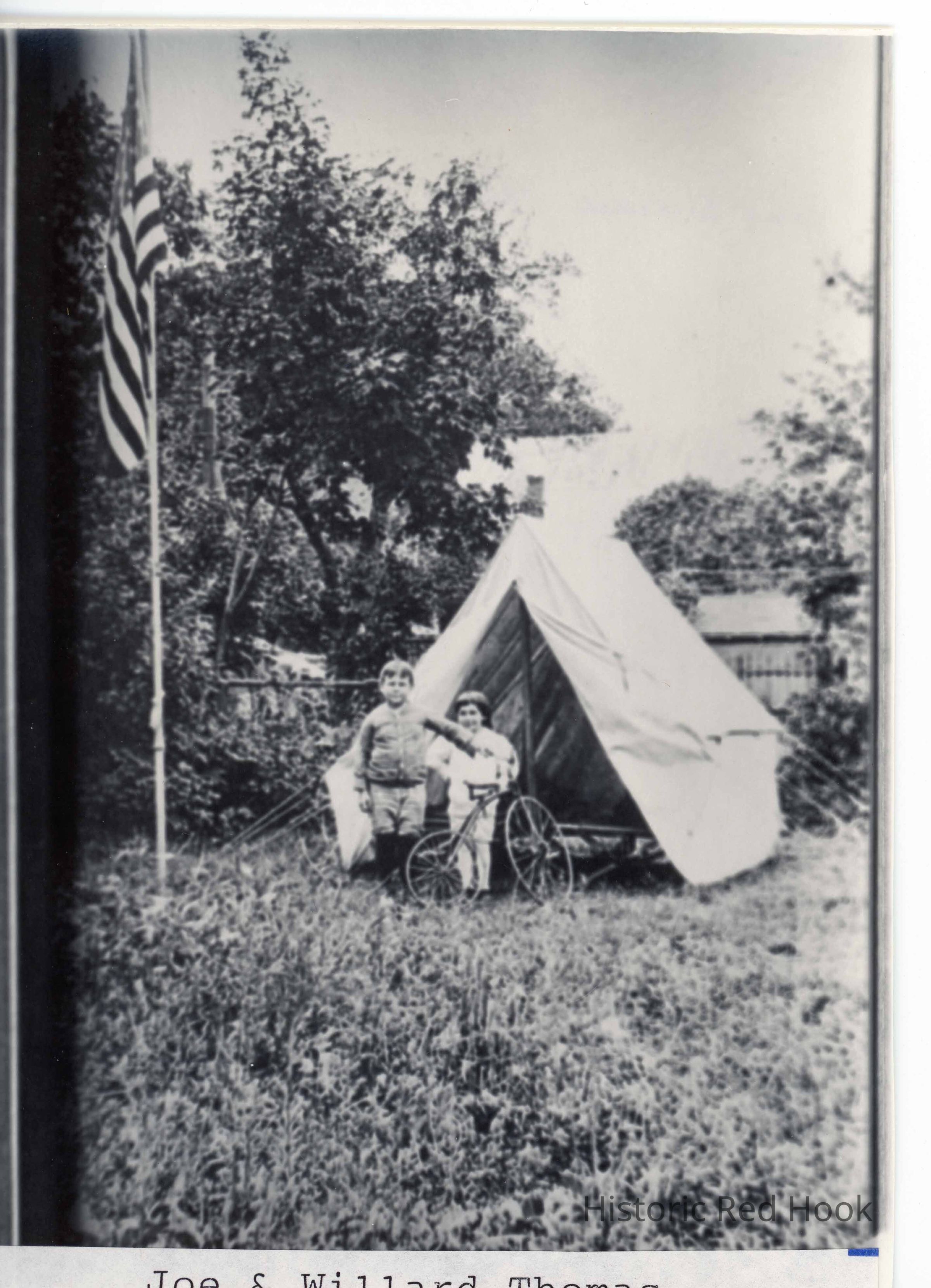 Image of two young children standing near a tent and flagpole with a bike identified as Joe and Willard ThomasPhotograph Details