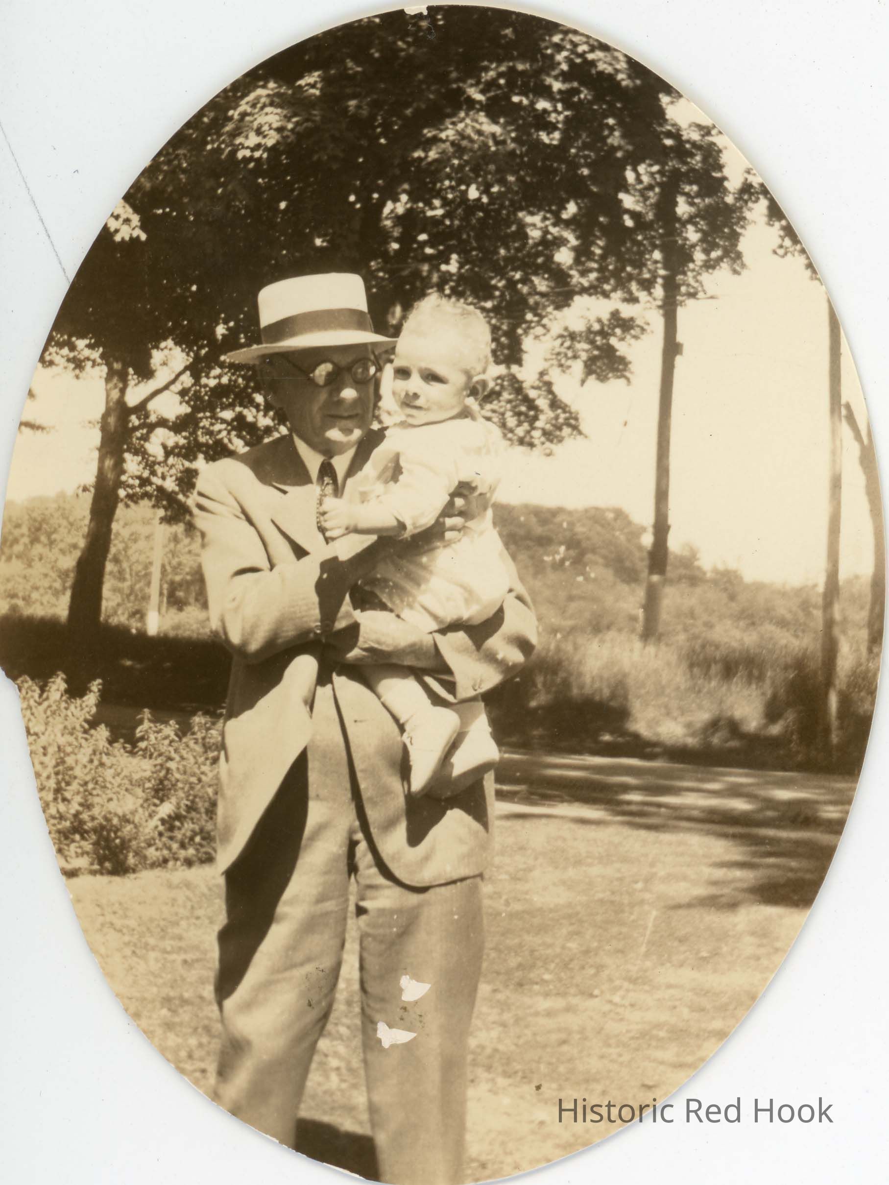 Black and white oval photograph of Joseph Griffing and Brandt (age 10 mos) standing outside in front of trees. 1935 written on back.Photograph Details