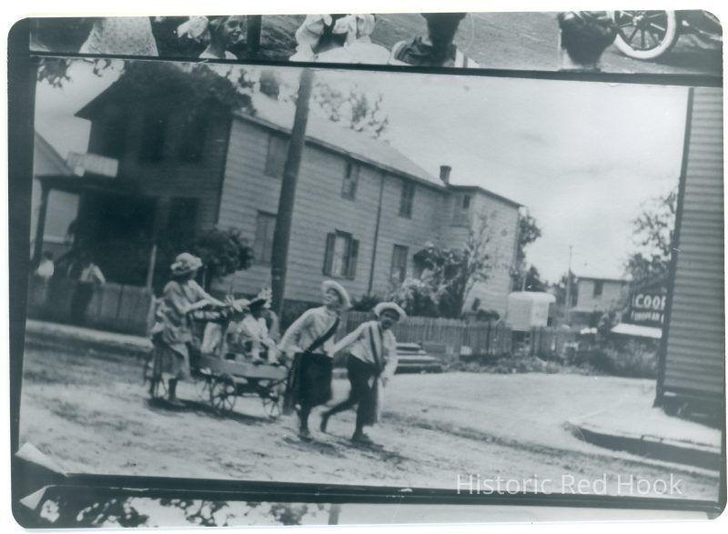 July 4 parade. Two boys pulling a child in a wagon down the street. A woman alongside tends to the child. Horse and buggy going down same street as prior images (2020.002.009 and .010) Date unknown - ca 1900? Photo of a photo.Collection