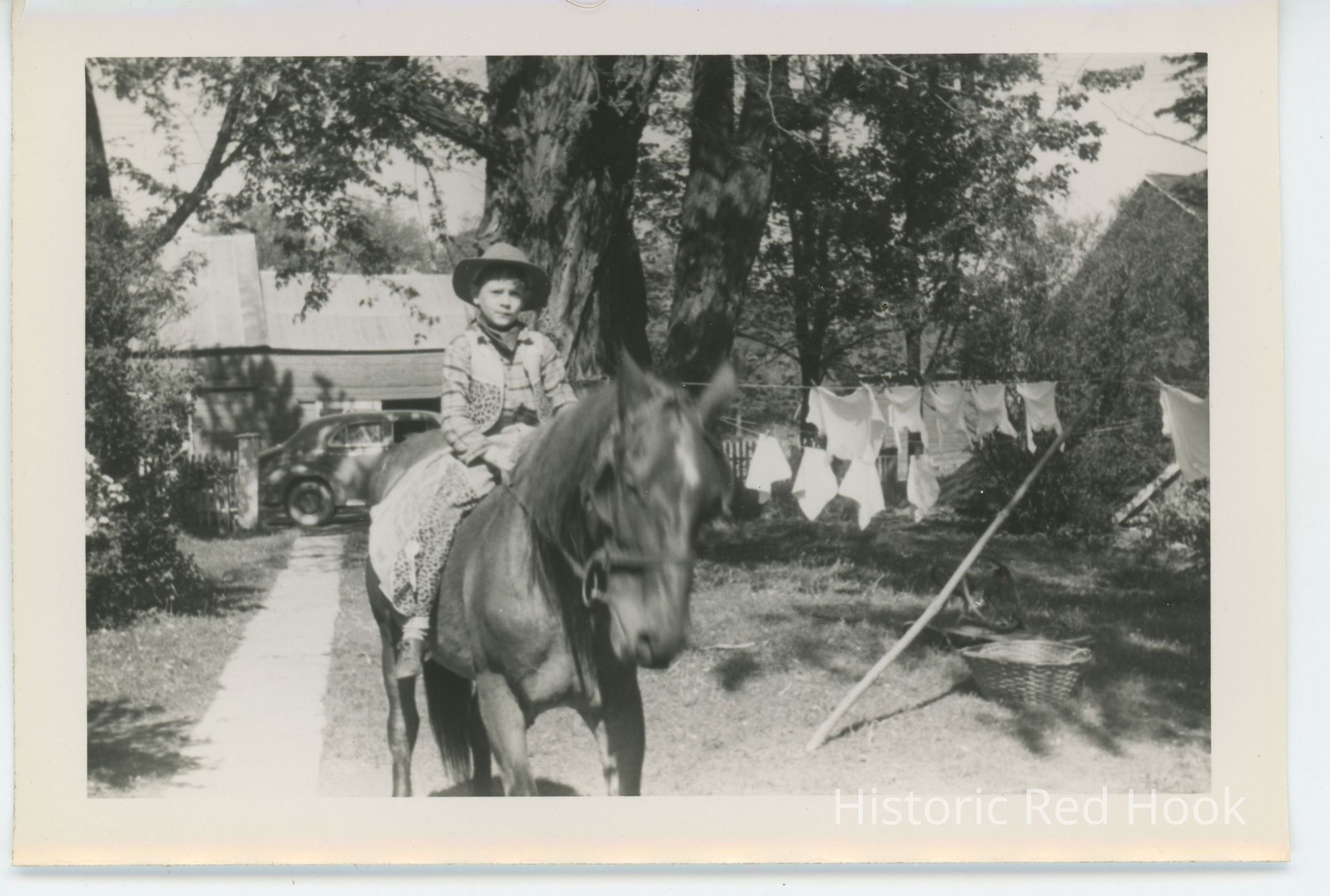 Kevin Klose on horseback in farmyard, c. 1947Entry/Object ID