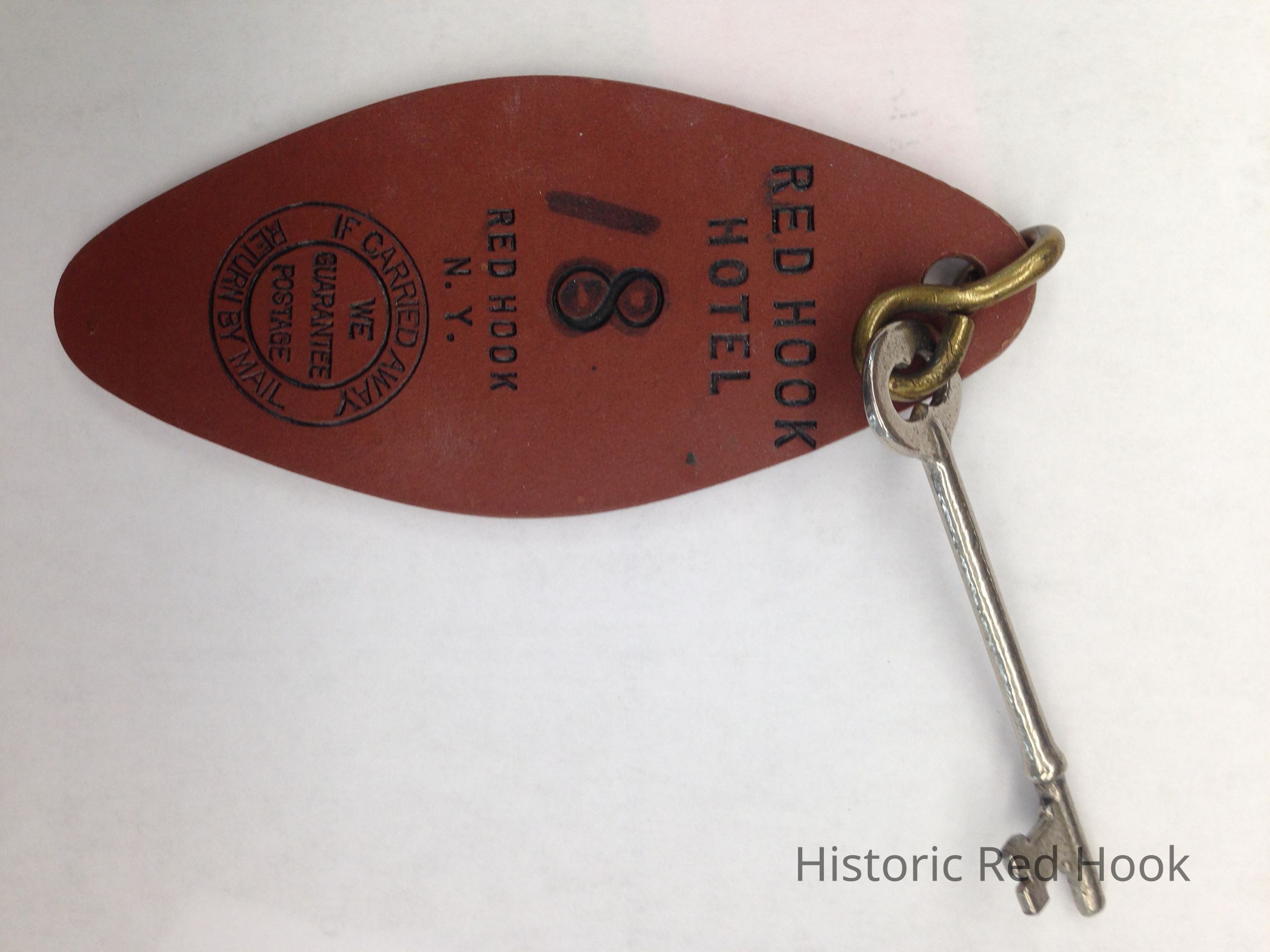 Key fob with key Red Hook Hotel imprinted with 8, handwritten 18