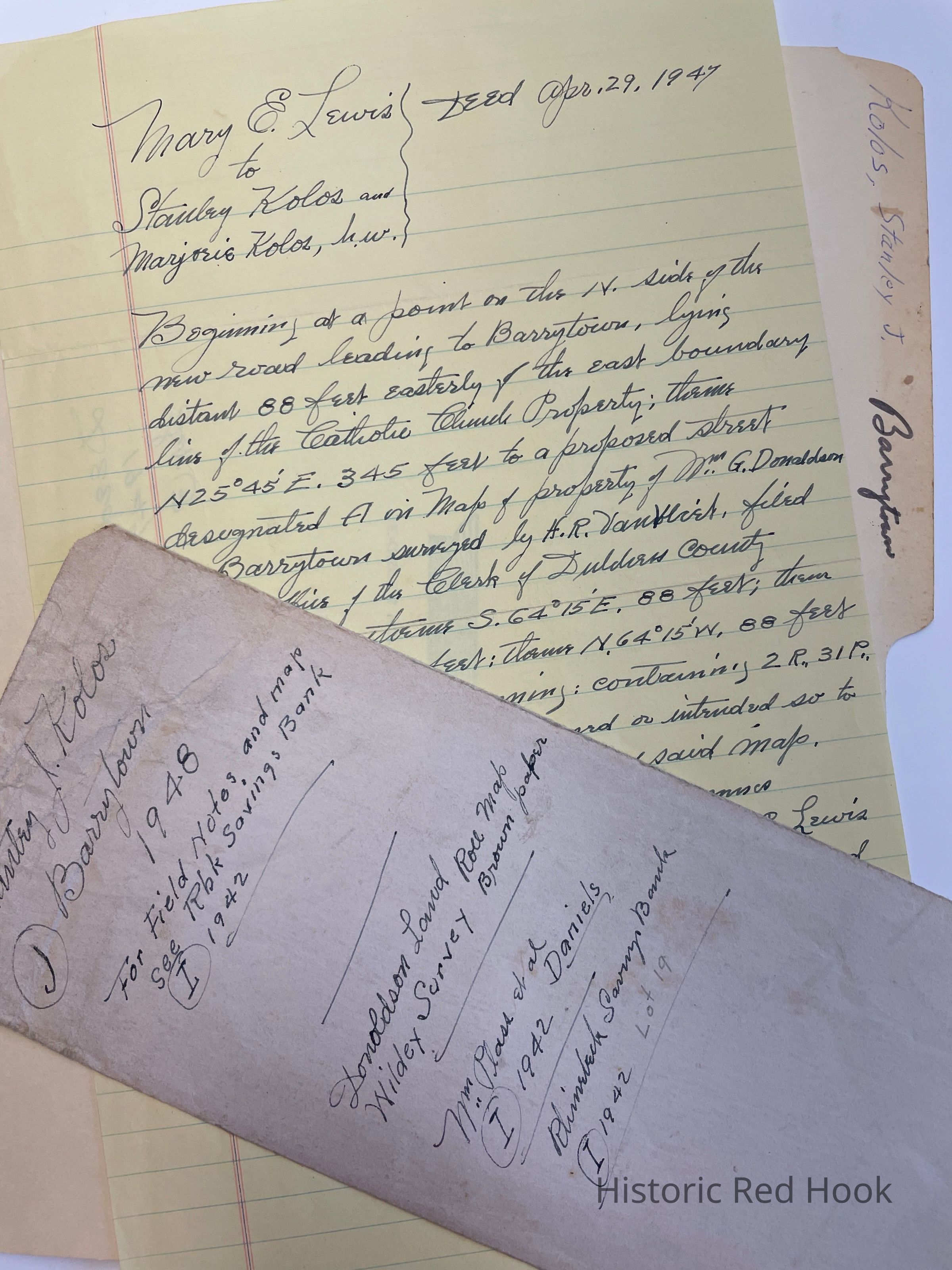 Deed: 29 Apr 1947 Mary E. Lewis to Stanley Kolos & wife Marjorie 2 roods, 3 perches. Being the 1st parcel to Warren & Mary E. Lewis by Edward A. Sullivan 30 Aug 1922 427:29Collection