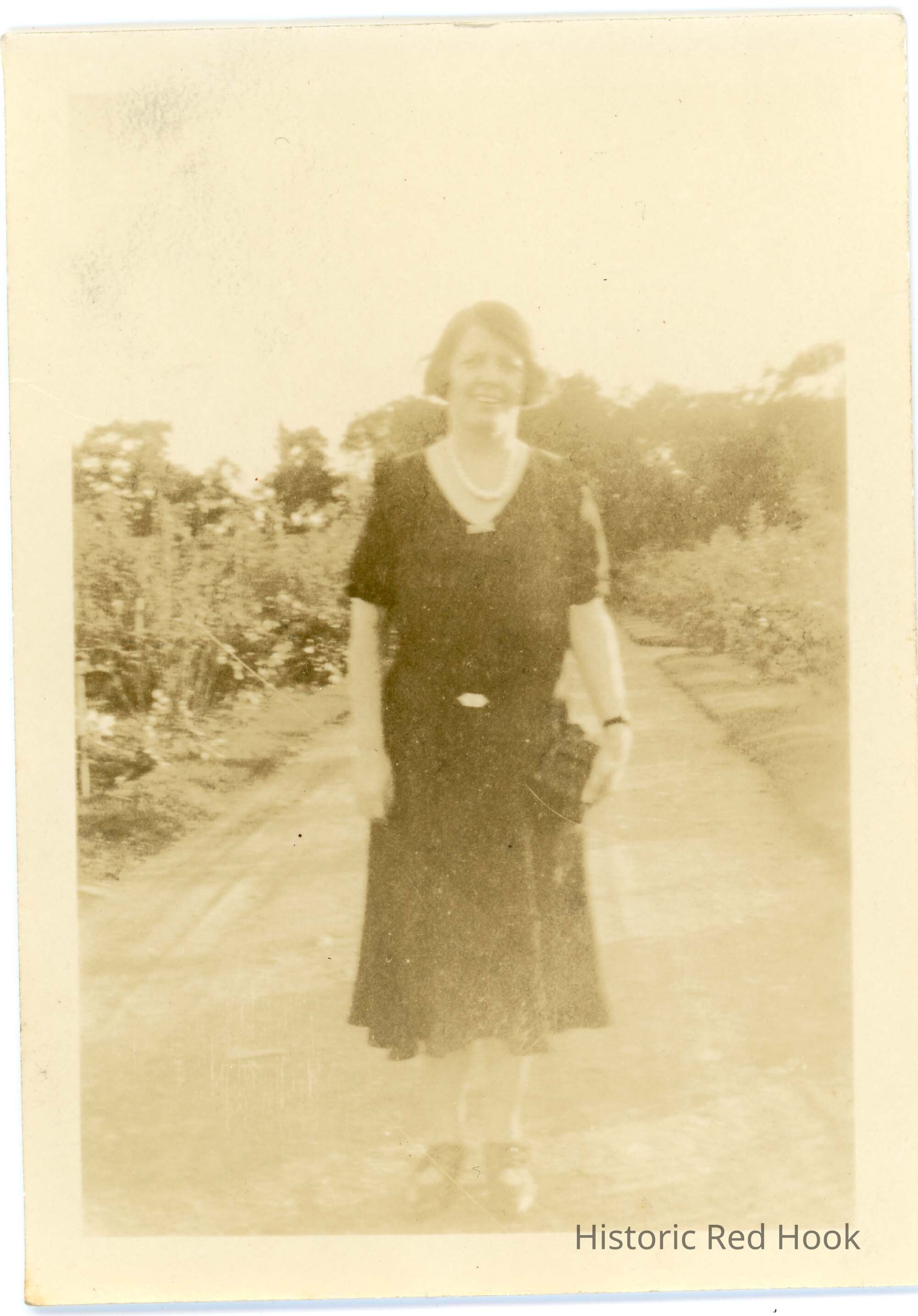 Lady standing in a Drive/Path with gardens on both sides - Undated.