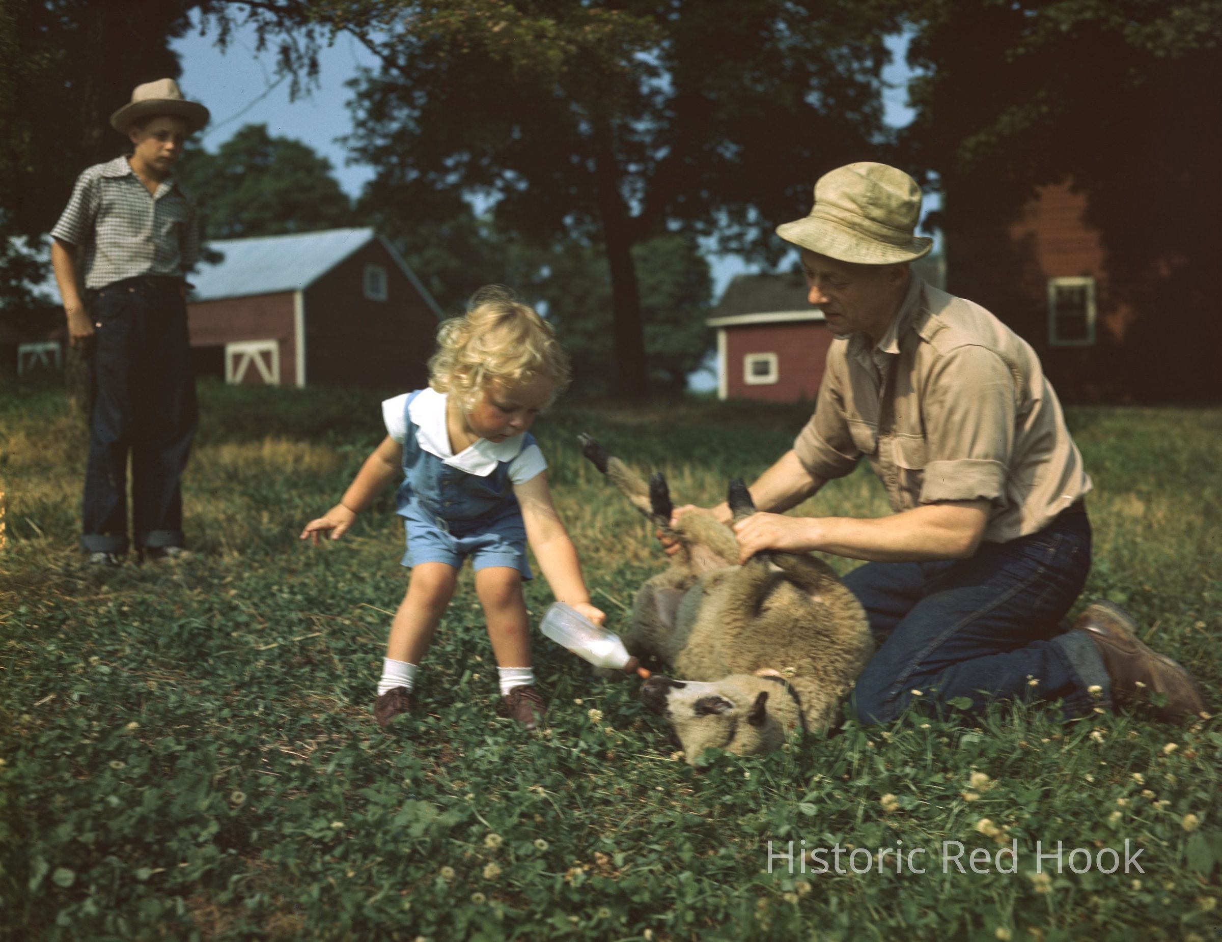 Woody Nicholas ("Nicky") Klose watches as his brother Christopher feeds one of the farm's spring lambs, held by their father, Willard ("Woody"), 1947Photograph Details