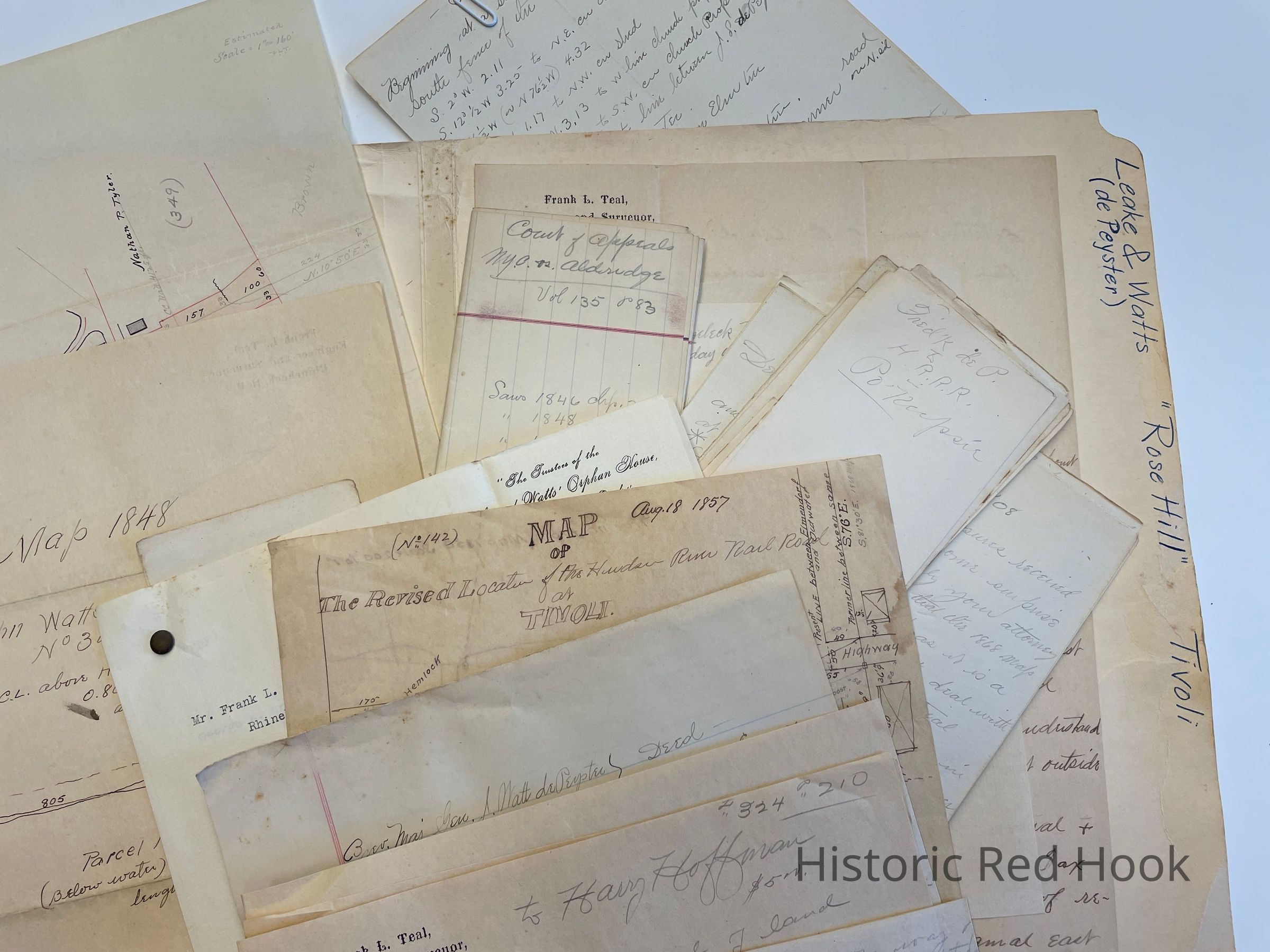 Deed: John F. Cox & wife to Edmund Elmendorf 1822 85:204. Certain tracts & parcels known as “Tivoli Farm” 62 acres. Mentions Landing of Dibble & Bostwick Co.; landing of Peter Outwater, highway from Myerville (Madalin); Robert L. Livingston, a building known as the “Factory” now occupied by a Albertson for a public house. Excepting out of above following lots as laid out by a printed map of Tivoli in 1795 249,250,277,283,284,289,290, heretofore mtged by Peter D. To Claudius G. Fontaine and also lots 35, 36,42, 42, 85, 86.