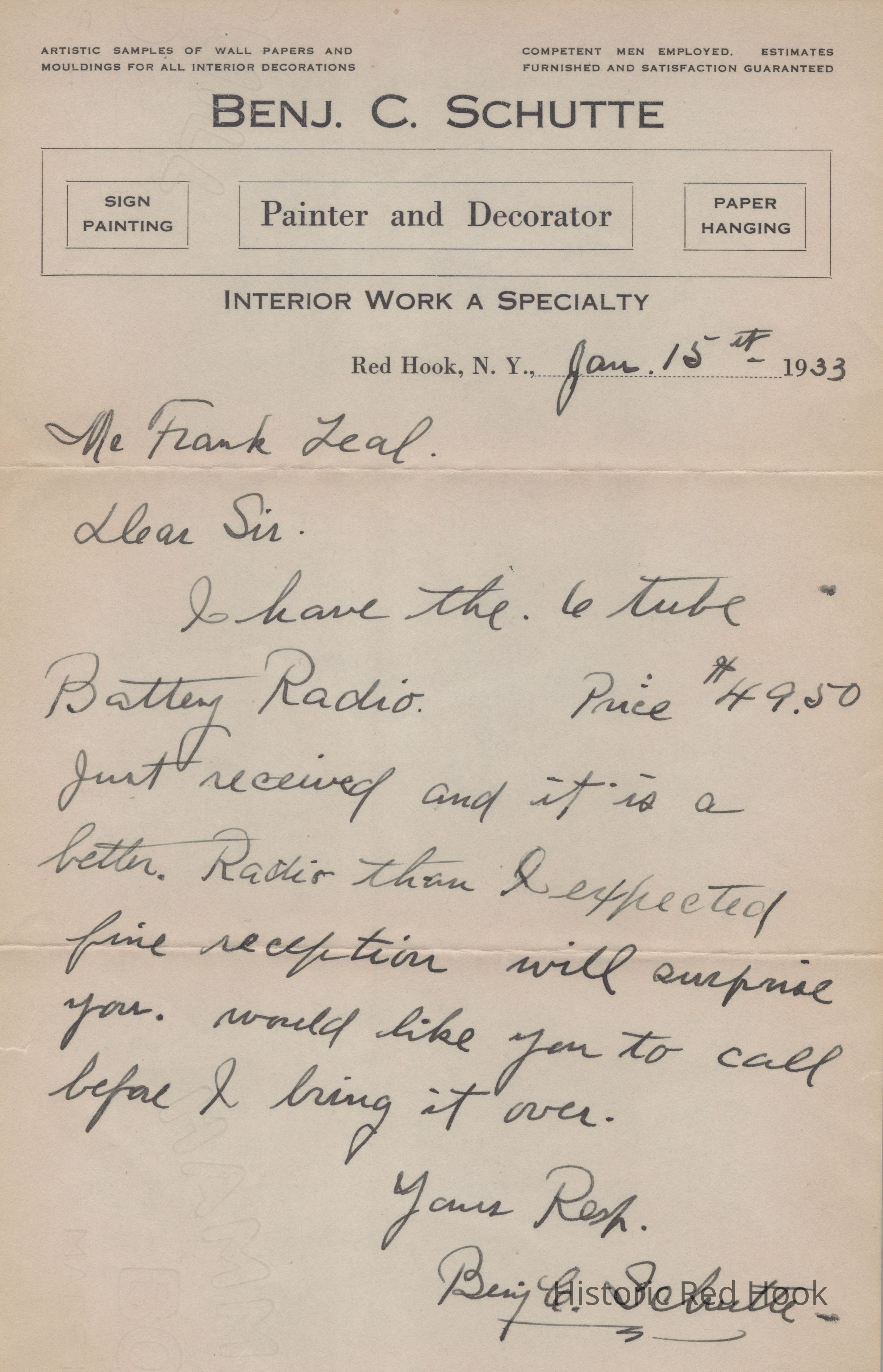 Letter from Benj. C. Schutte to Frank Teal, Jan 15, 1933, notifying him of a battery radio for $49.50.Relationships