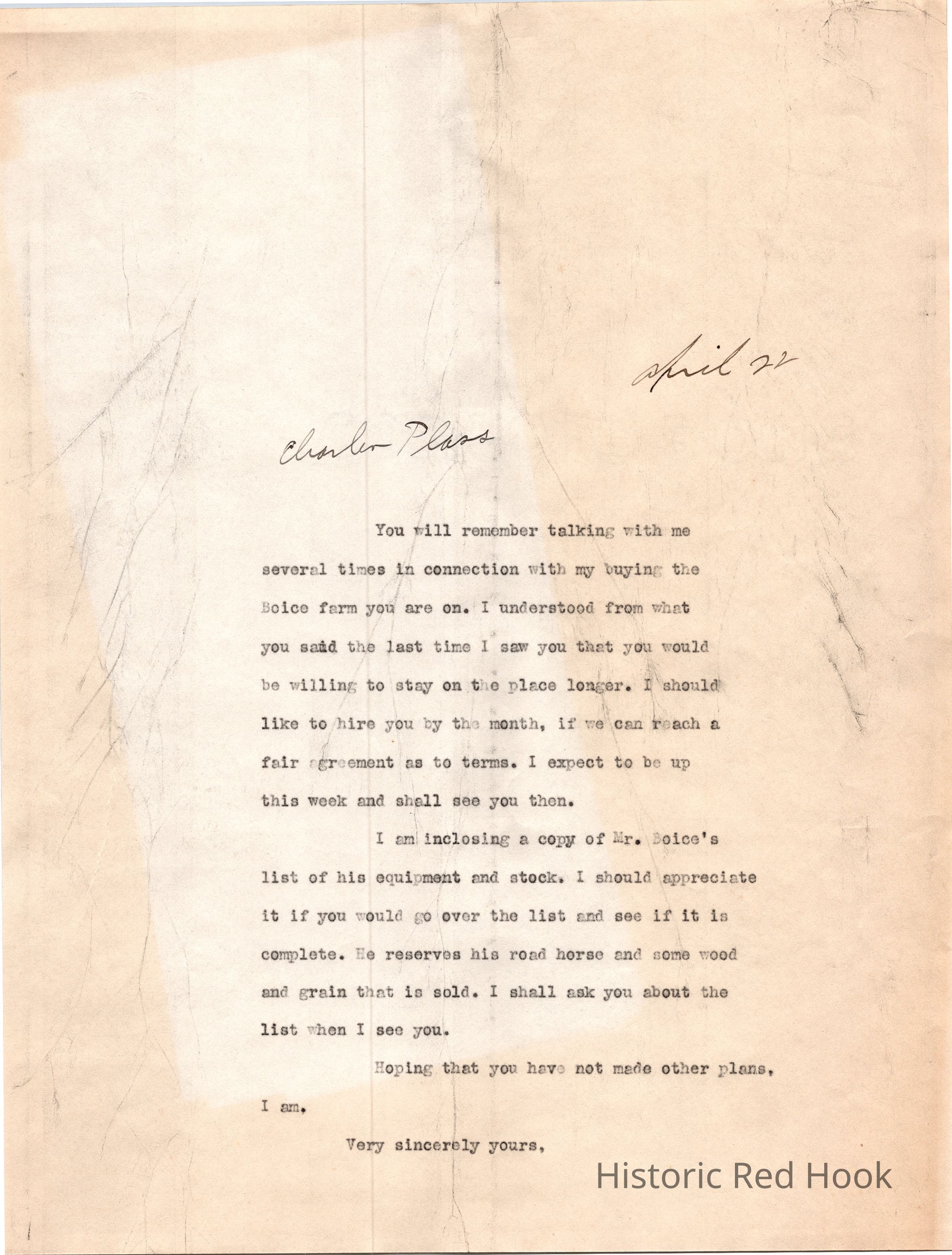 In this note dated Aprill 22, (likely 1916), Mead states that he intends to buy the Bocie farm, and would like to continue Plass’ employment on the farm on a monthly basis. Mead also requests that Plass verify Boice’s list of equipment and stock (included in the sale).