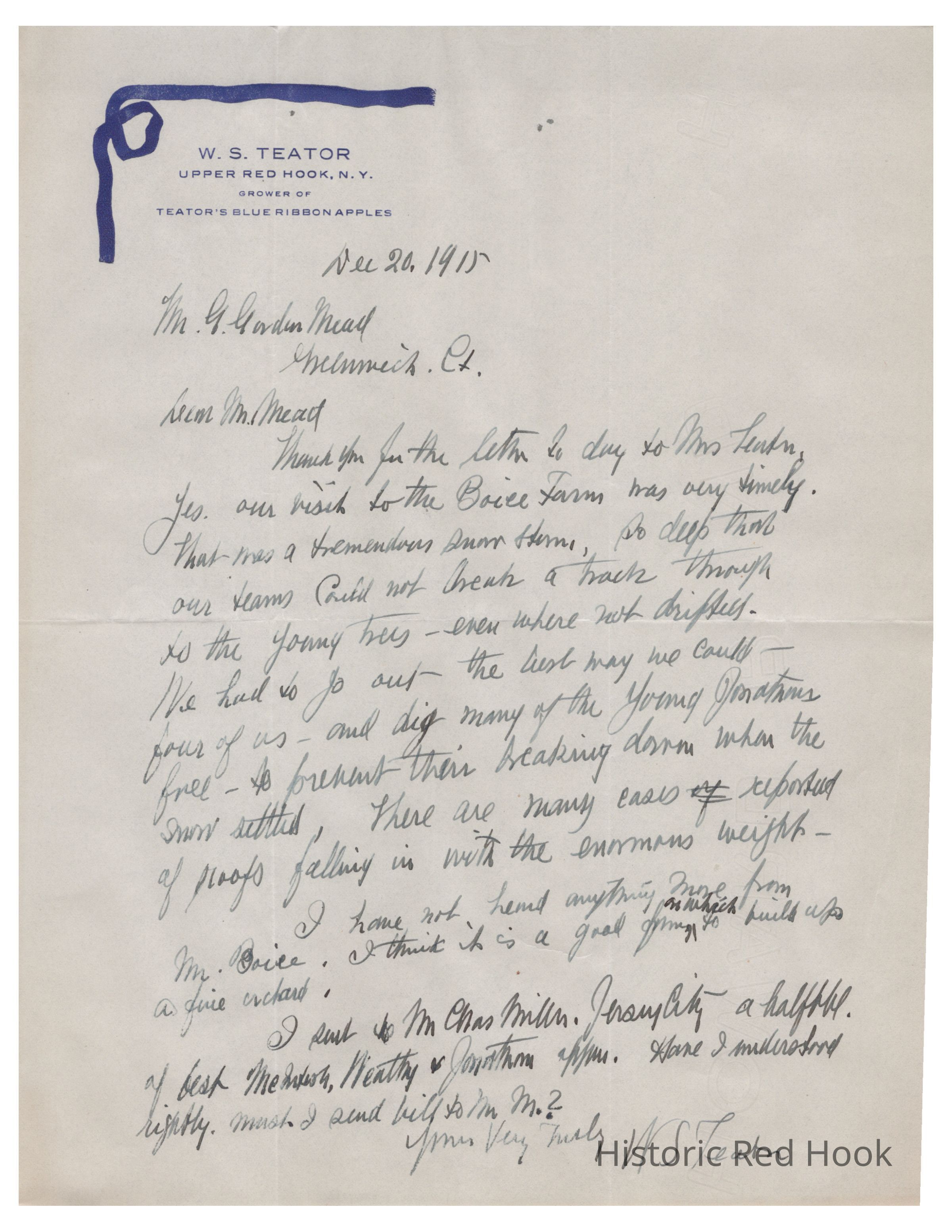 In this letter dated December 20, 1915, Teator thanks Mead for his letter to Mrs. Teator, and describes the difficult winter conditions affecting local farms. Many roofs have fallen in due to the weight of the snow. Teator contributes that he hasn’t heard from Mr. Boice, and stresses that Boice’s farm has a fine orchard, seemingly hoping to influence Mead’s purchase of the farm. In the PS section, Teator mentions an apple show in Poughkeepsie, and hopes that Mead attends it.Relationships