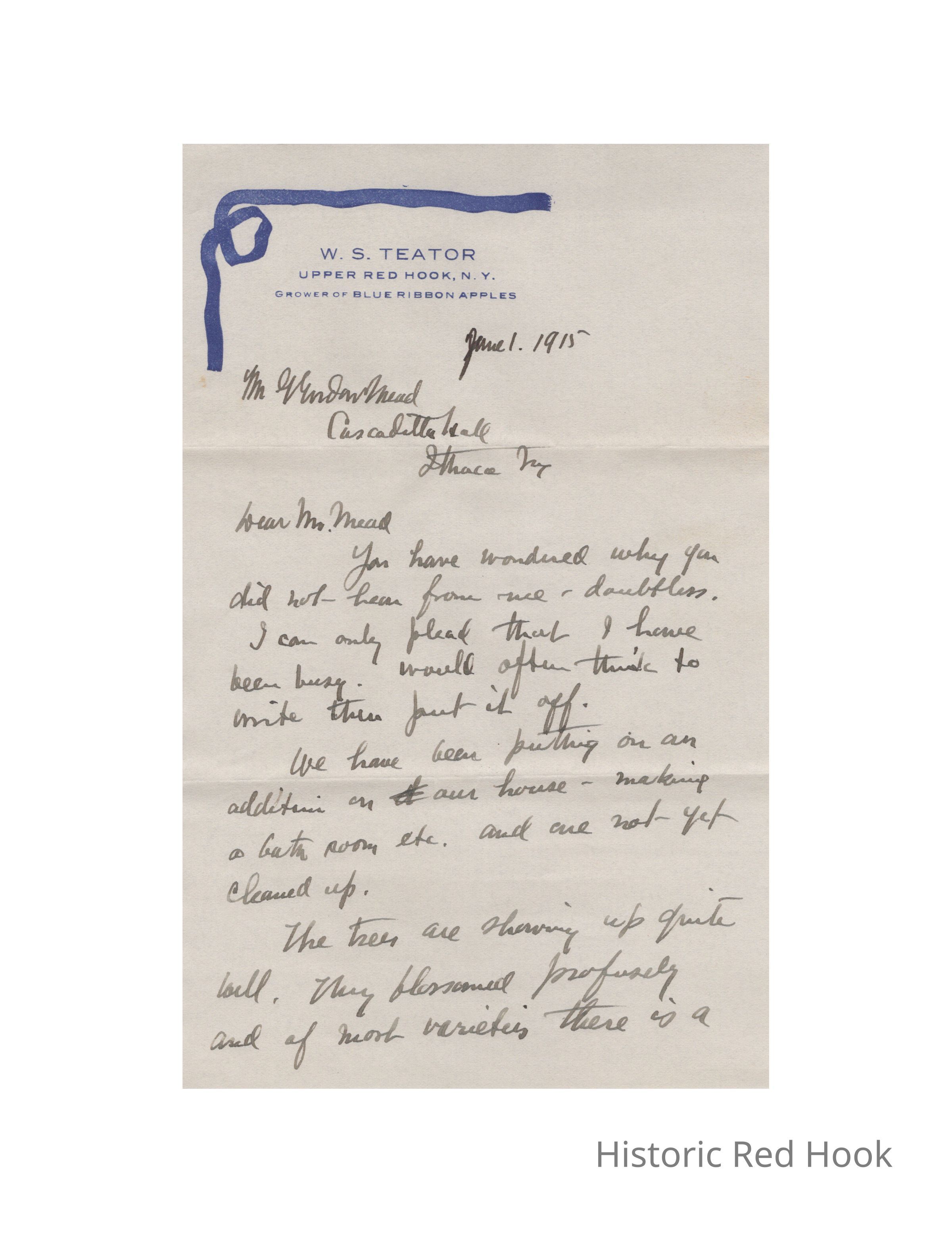 In this June 1, 1915 letter, Teator explains that he is putting an addition onto his house, and has been less available to Mead due to this. He states that the orchards are doing well. He is now busy with trimming season, and is spraying his fields to avoid troublesome insects. Teator hopes to see Mead soon to discuss business plans.Relationships