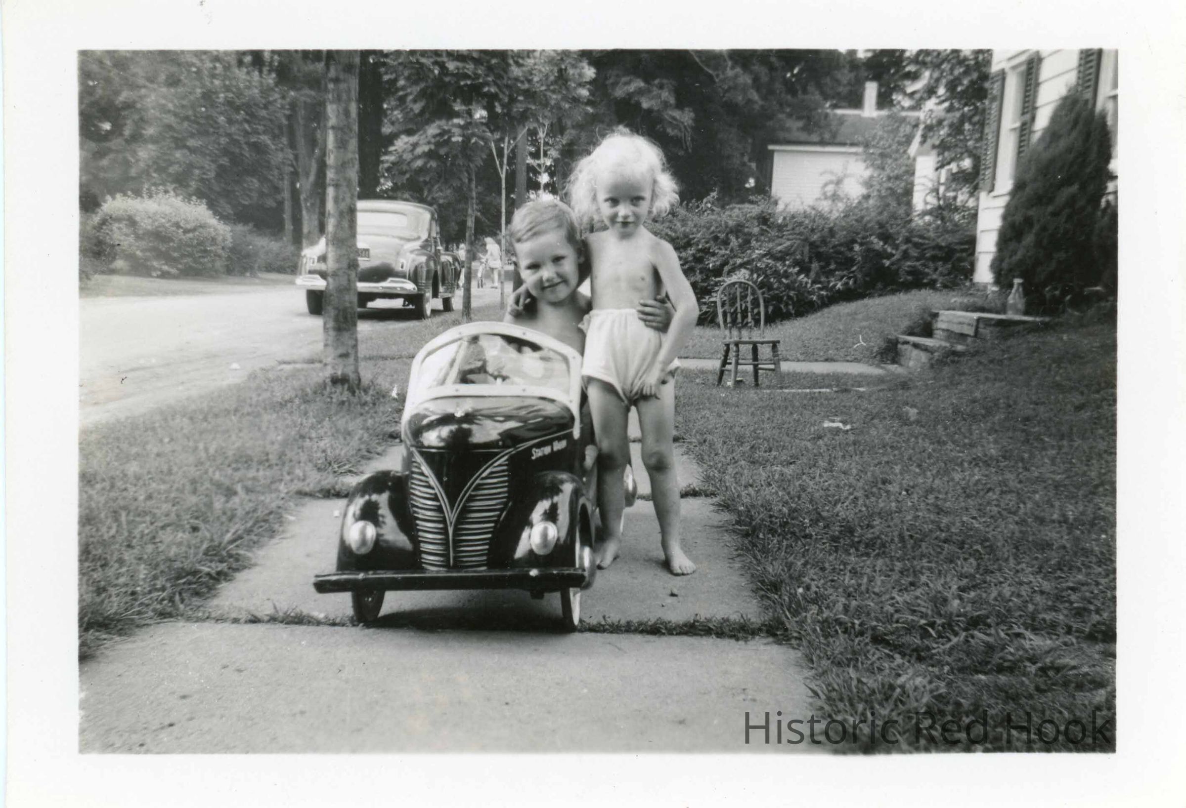 Outdoor photograph taken of two young children, one driving a play car and the other nearby, on a side walk in front of a home identified as Linda & Dick ThomasPhotograph Details