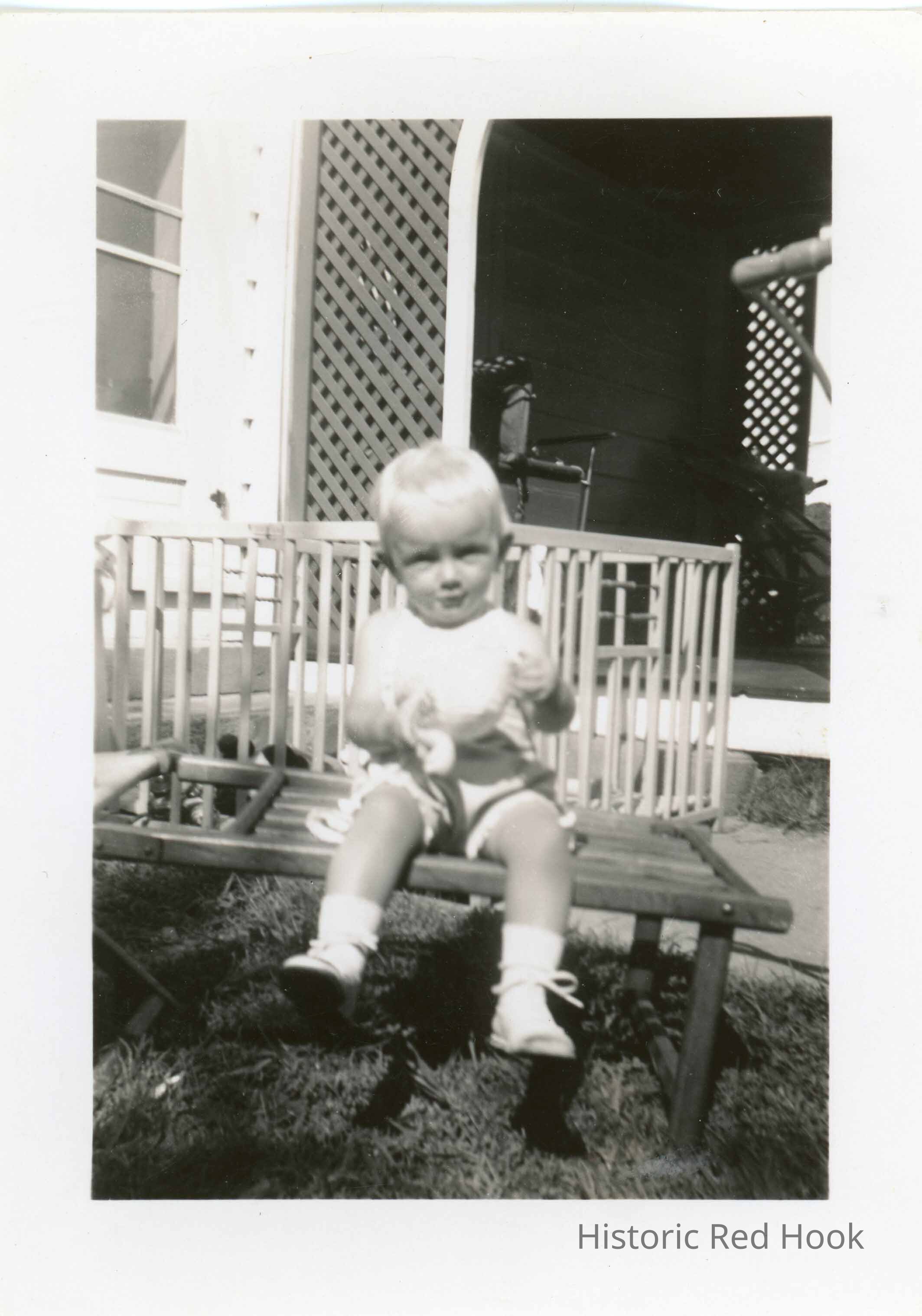 Informal Photograph of toddler posed seated on a lawn chair near a play pen outdoors identified as Linda Kane