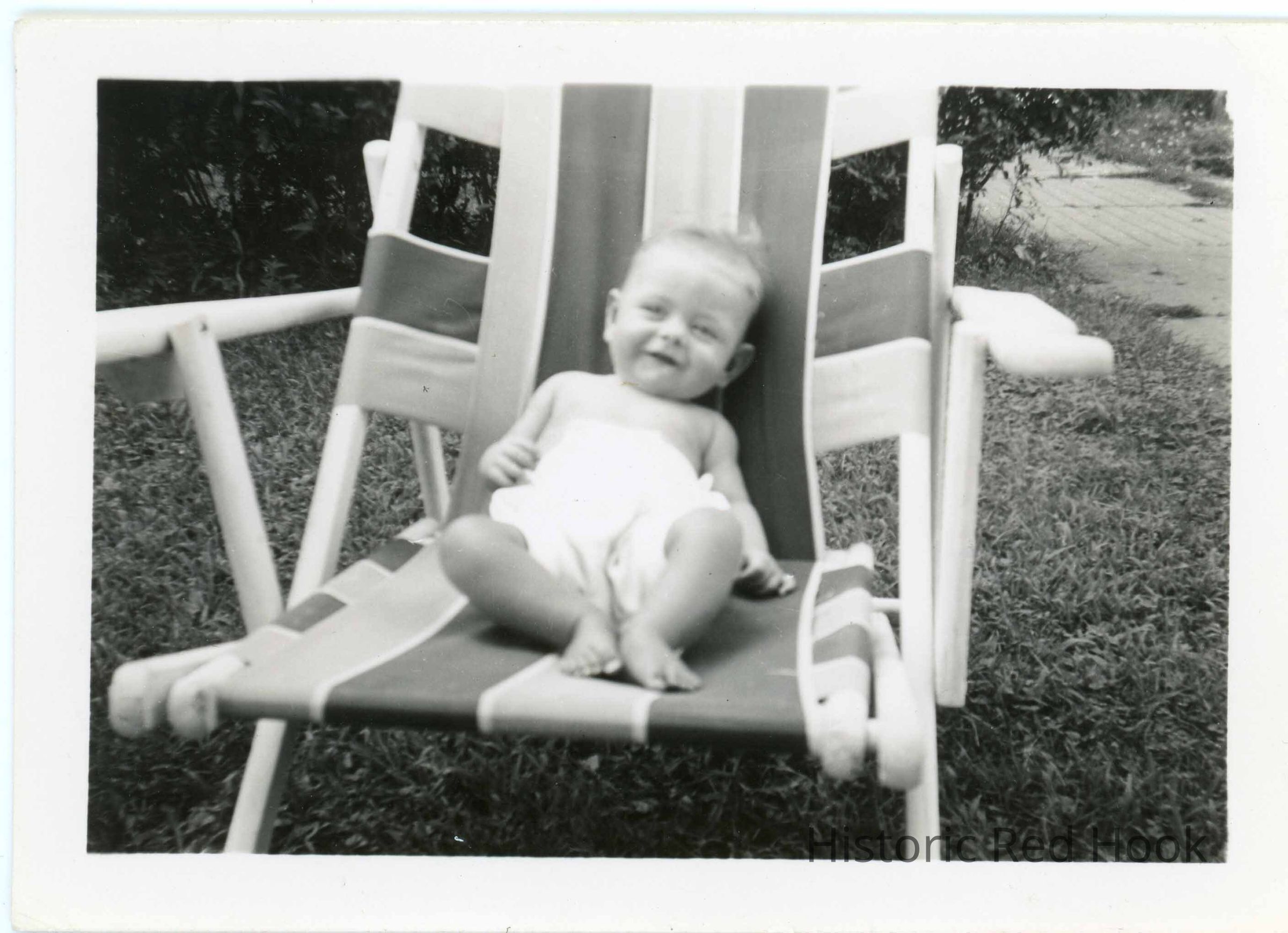 Photograph of a young baby posed sitting in a lawn chair near a sidewalk identified as Linda KanePhotograph Details
