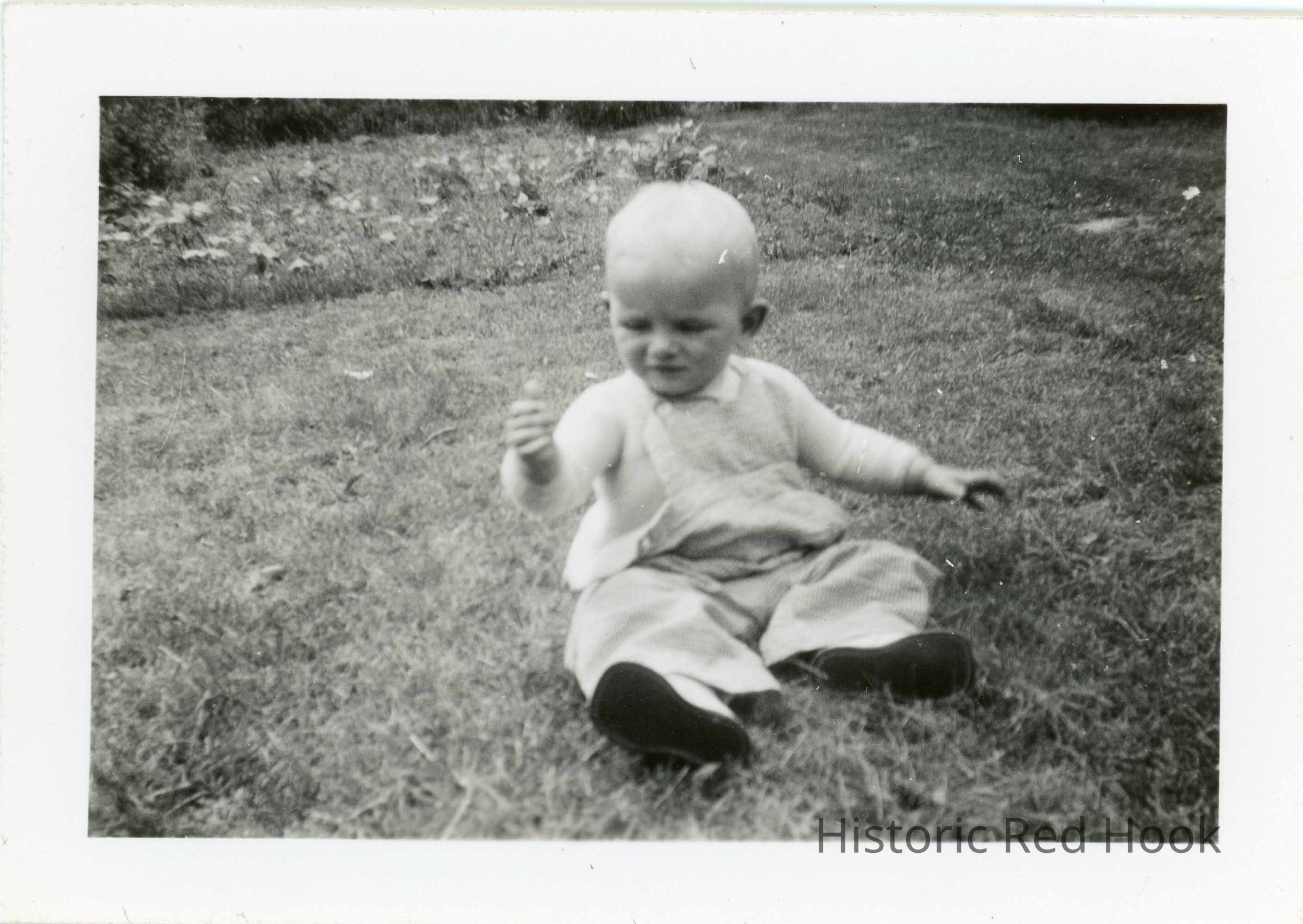 Photograph of a toddler sitting on a lawn identified as Linda Kane