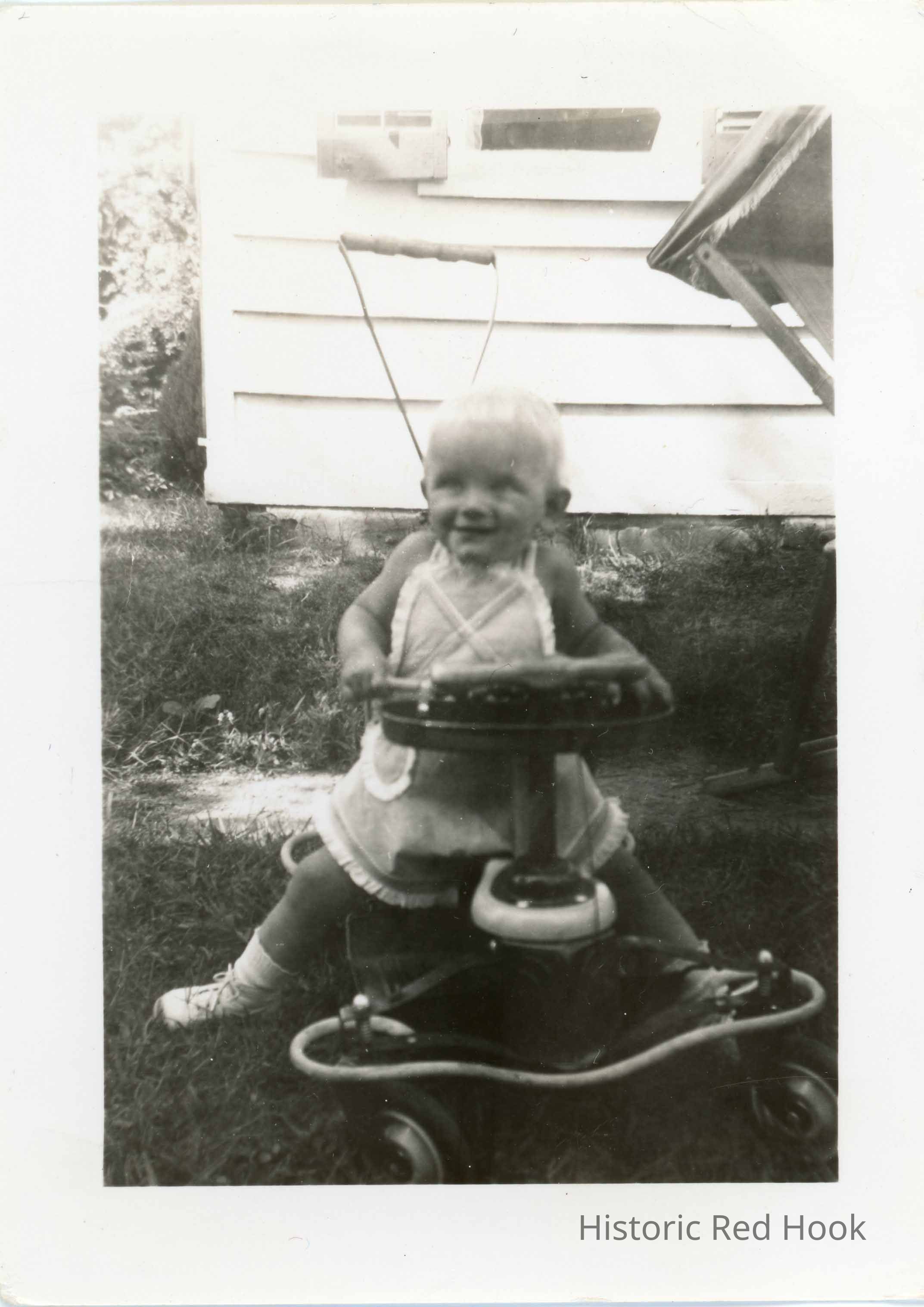 Photograph of a toddler pictured outdoors in a walker near a home taaken in 1940.