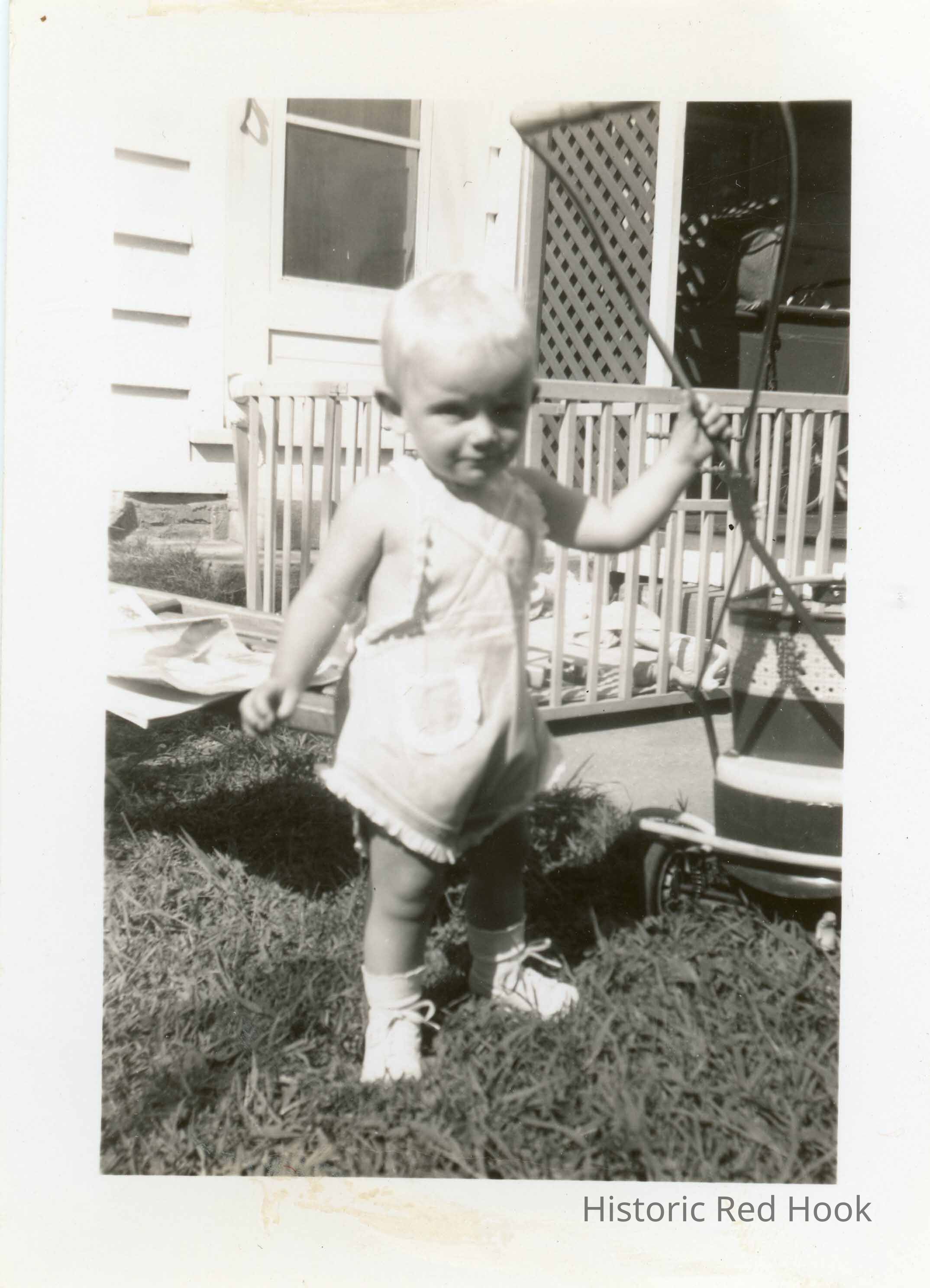 Photograph of a young toddler posed on the lawn near a play pen identified as Linda Kane Sept. 1940Photograph Details
