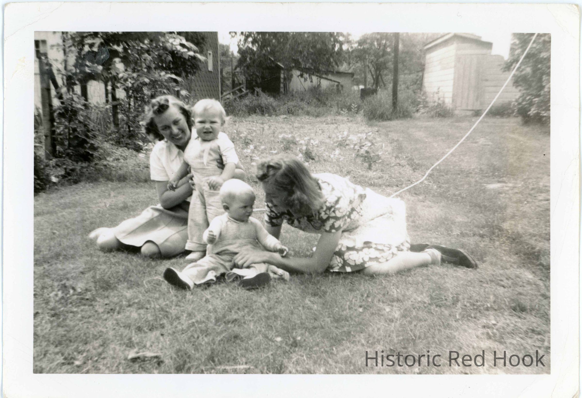Informal photograph of two women pictured with two toddlers on a lawn identified as "Me, Dickie, Linda Kane & Saph 1940"Photograph Details