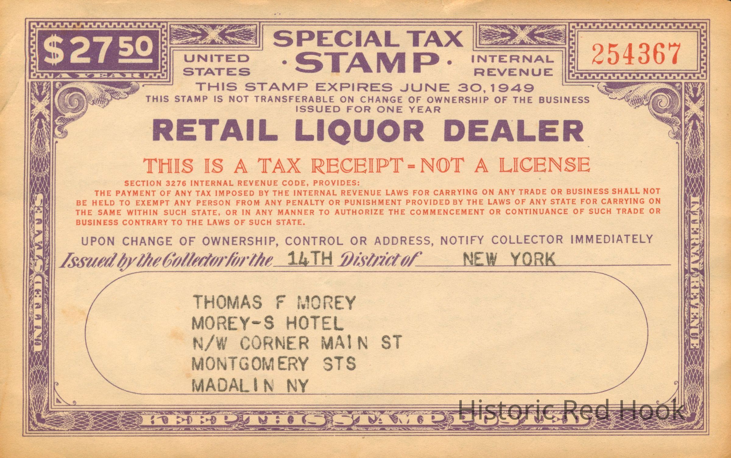 Tax receipt for retail liquor license Morey's Hotel, Madalin, NY.Collection