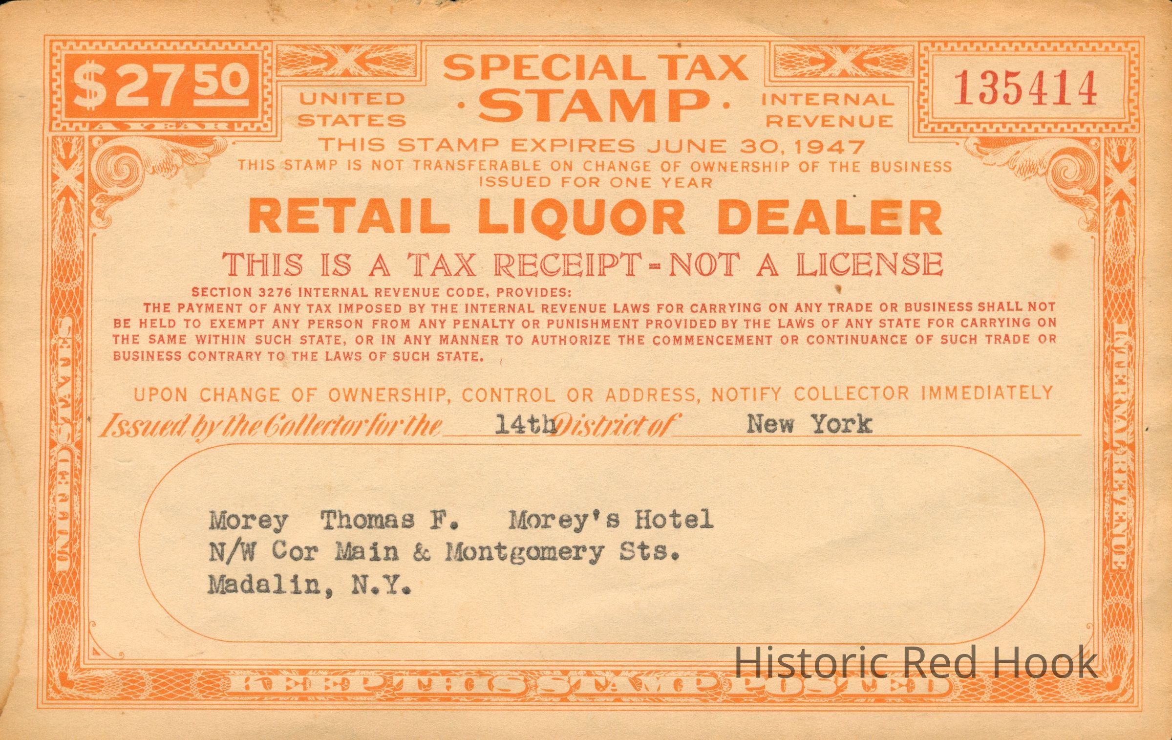 Tax receipt for retail liquor license Morey's Hotel, Madalin, NY.Collection