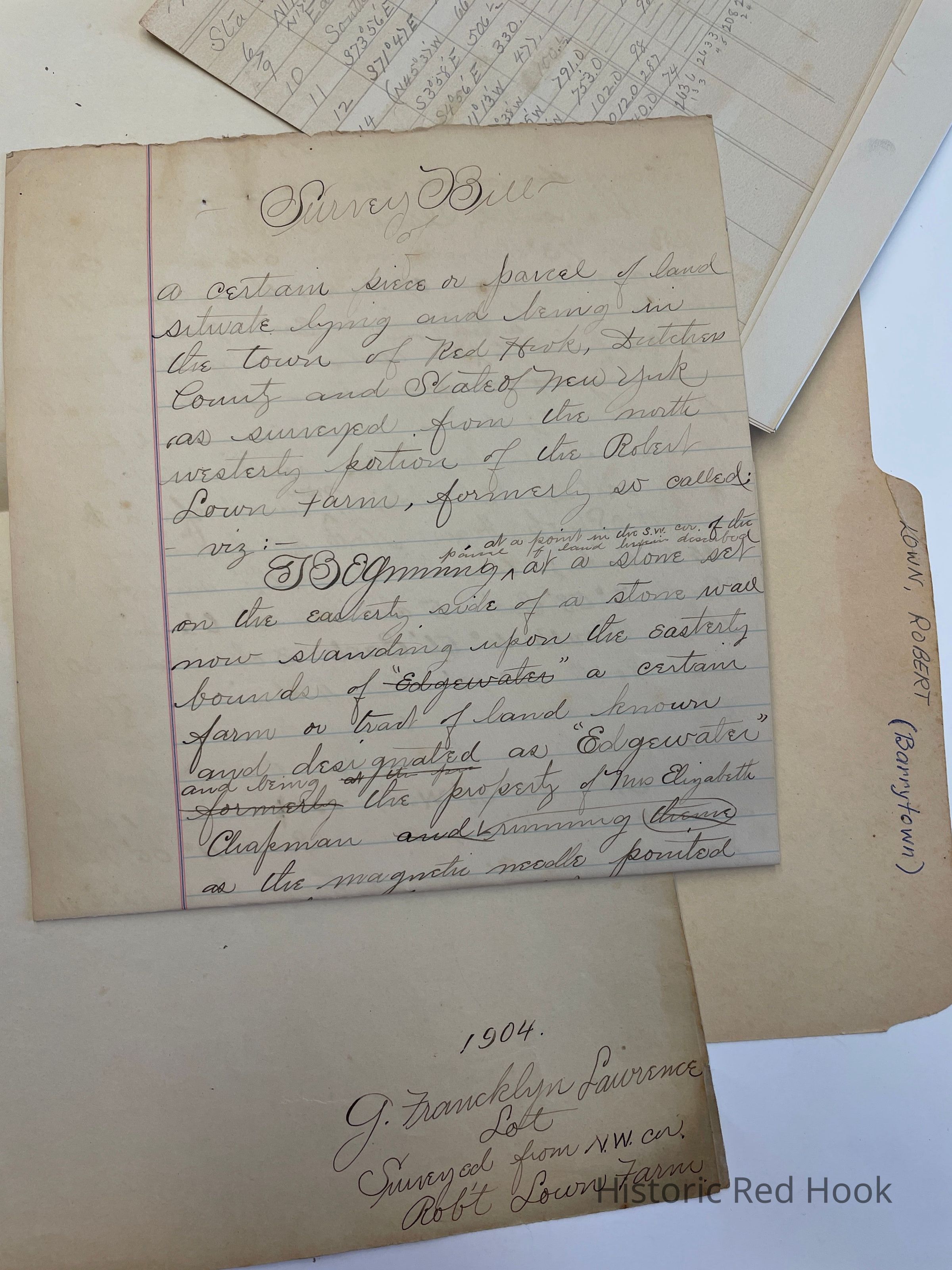 Map: 1904 G. Franklin Lawrence Lot Surveyed from NW corner of Robert Lown Farm 38 acres. Mentions: East bounds of “Edgewater”, property of Mrs. Elizabeth Chapman; public school grounds, westerly corner of Isaac Snyder, certain building now used as a blacksmith shopCollection
