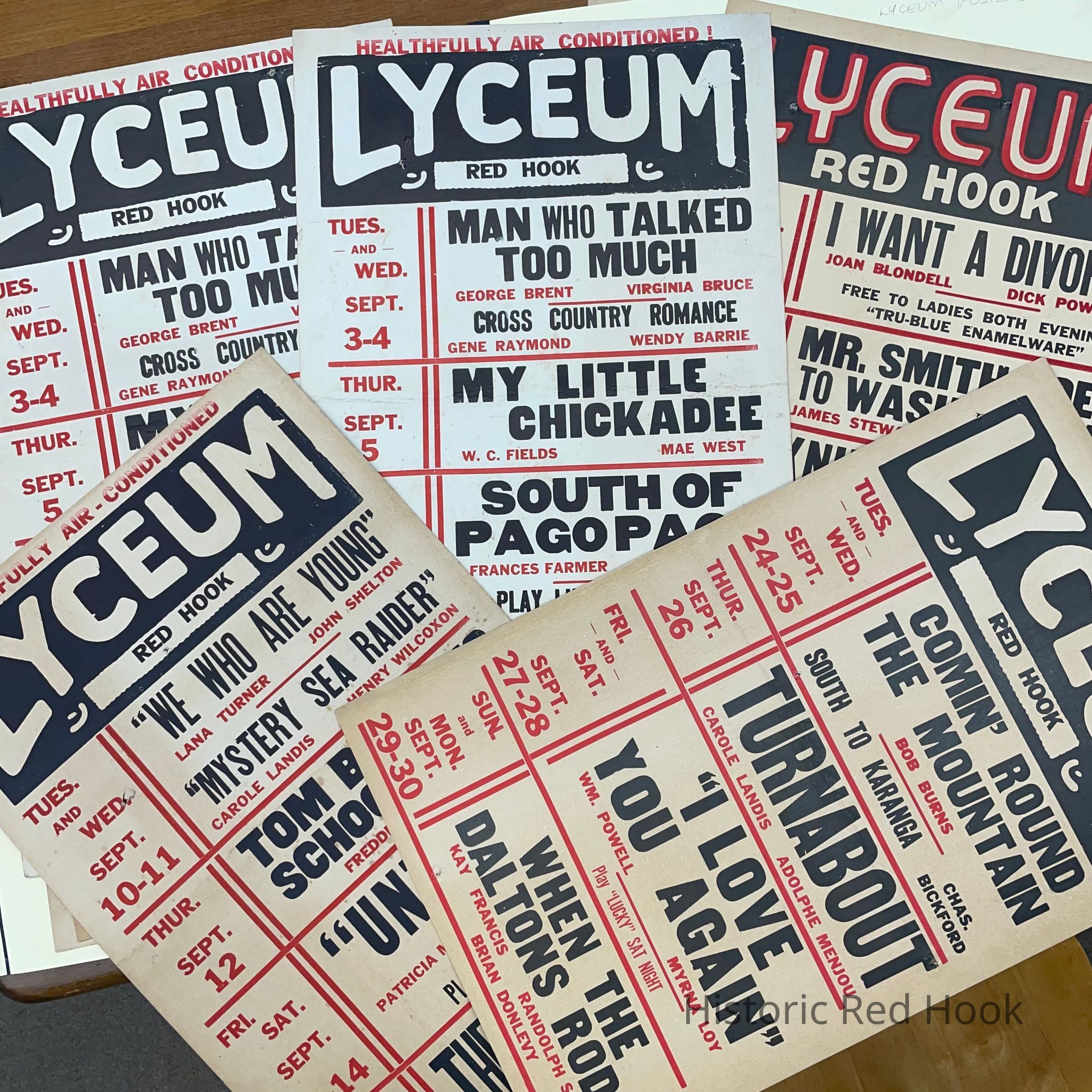 Collection of cardboard posters (21 originals) advertising movies shown at Red Hook's Lyceum Theater on East Market Street, in 1940 - stored in three folders.