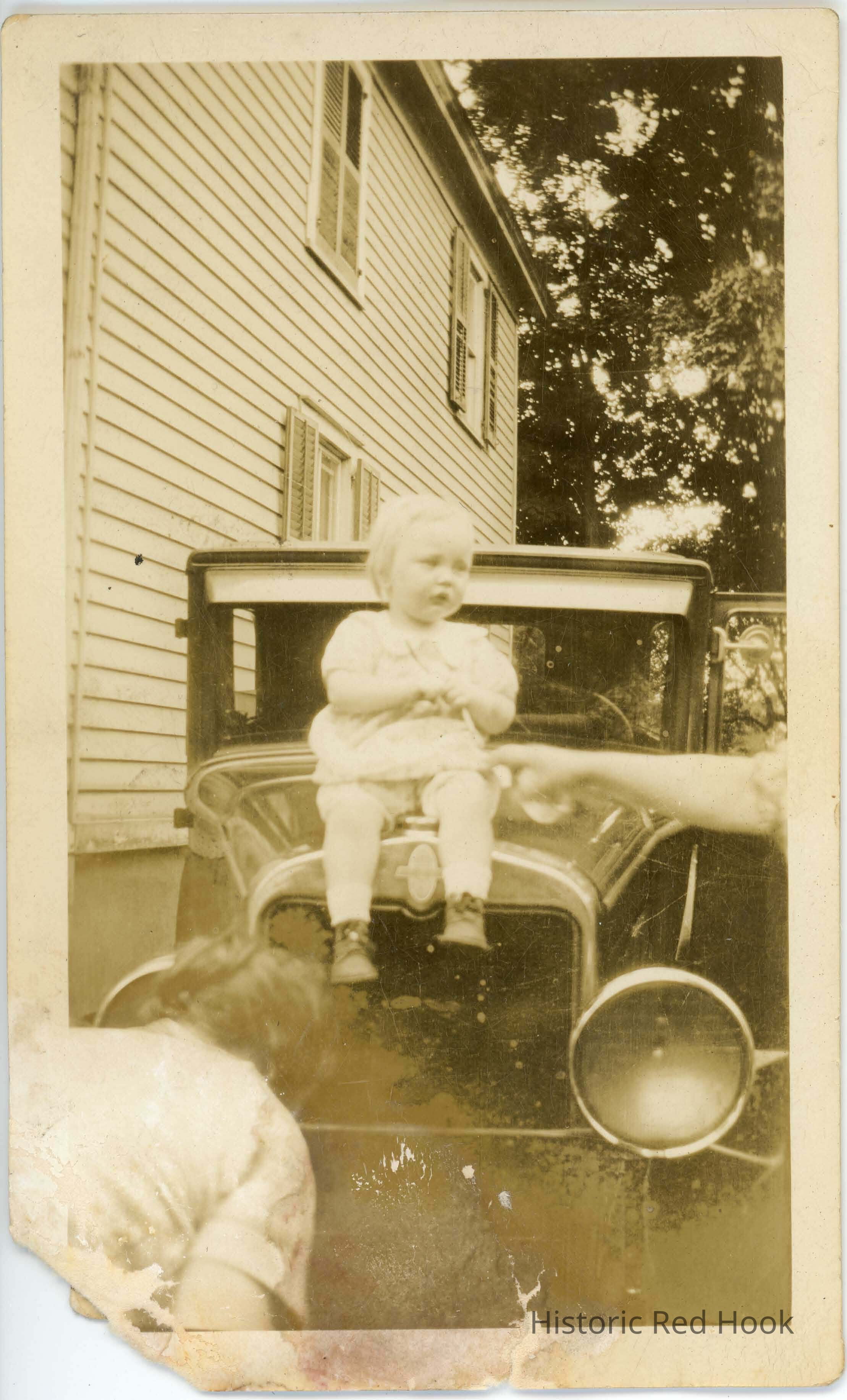 Margaret Riddleburgh Doty, as a toddler, sitting on the hood of an old car.Photograph Details