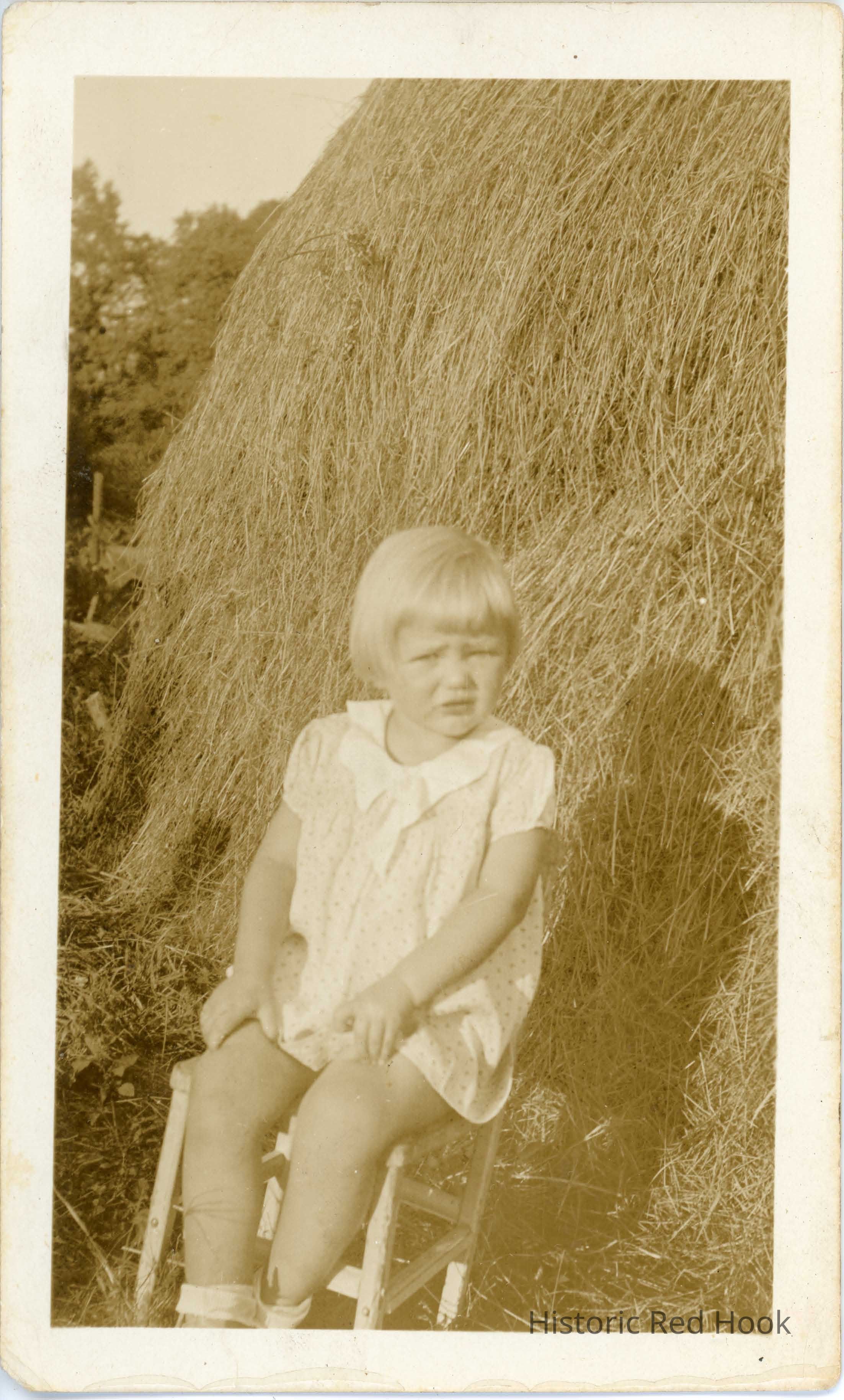 Margaret Riddleburgh Doty, as a very young child, seated before a large haystack built by her father, Charles, Jr., who cut, raked and stacked the loose hay by hand with his horse.Photograph Details