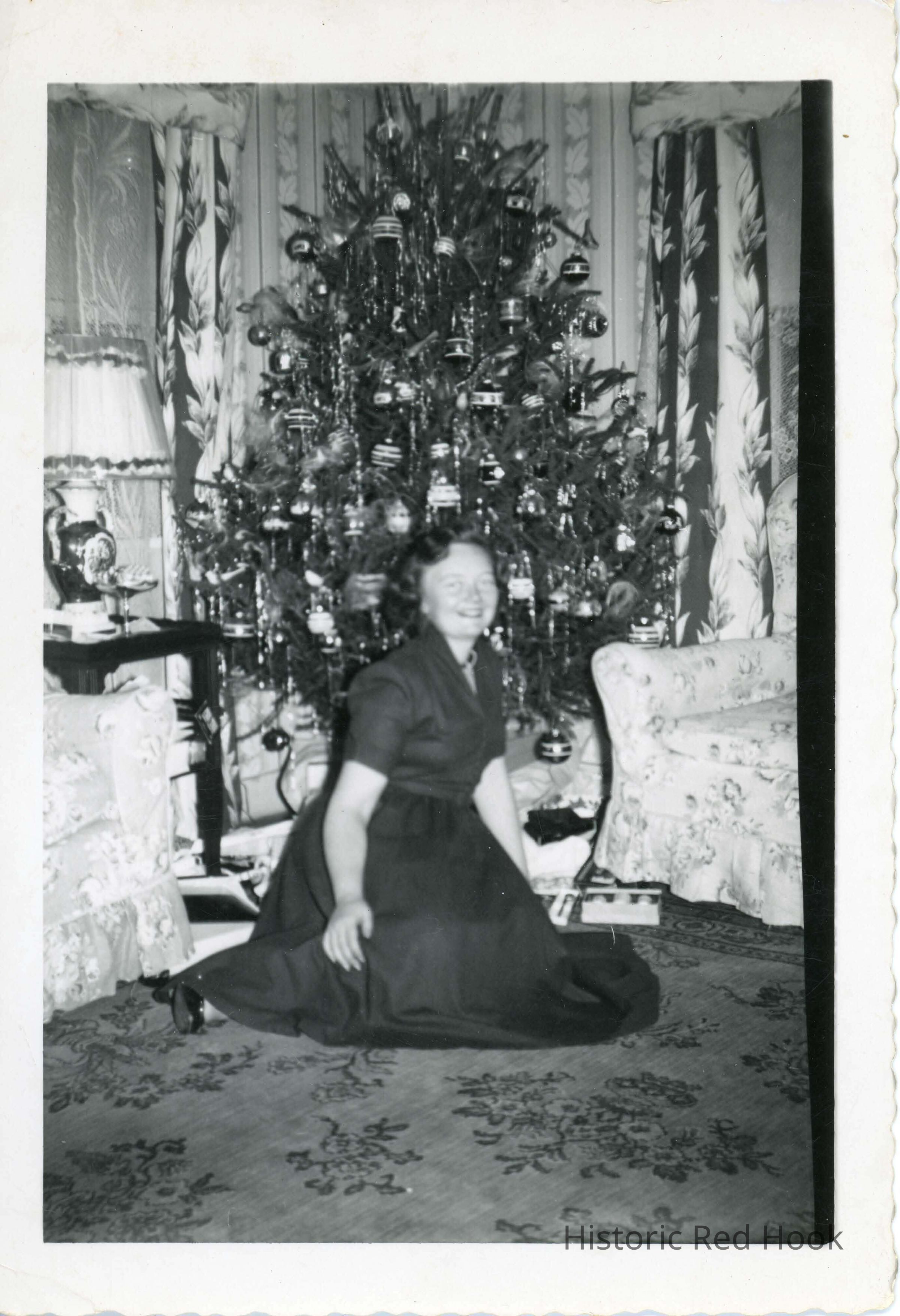 Margaret (Riddleburgh) Doty sitting in front of a Christmas tree.