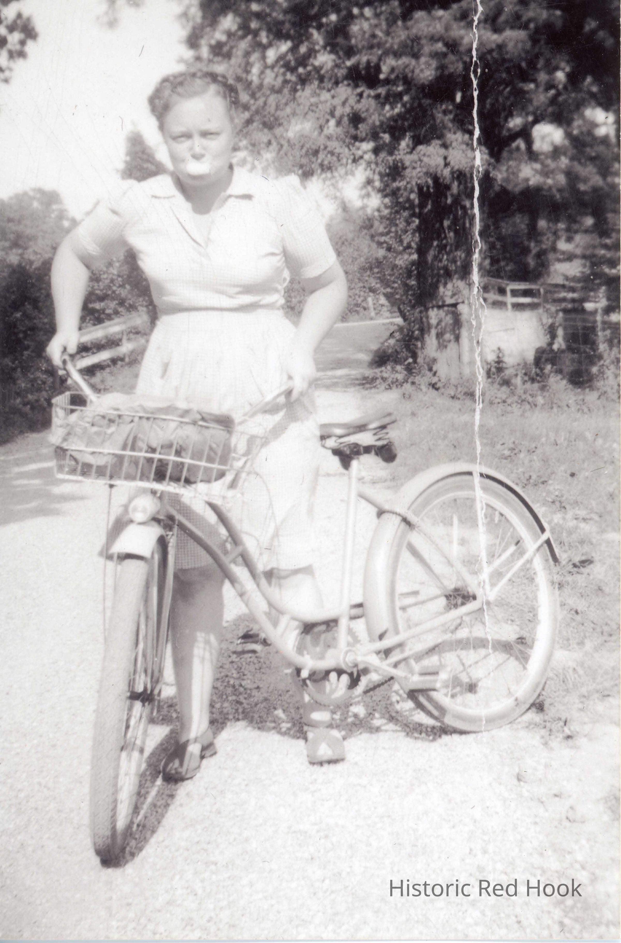 M. Doty on her bike, blowing bubble gum.