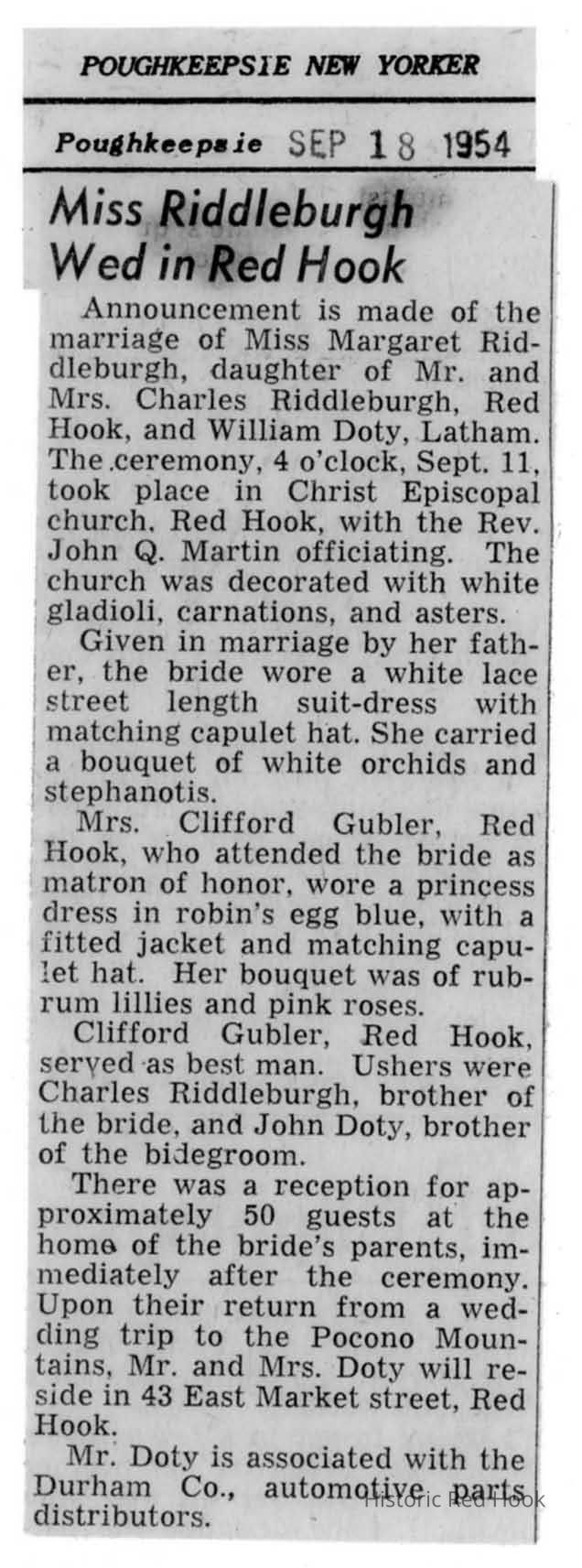 The wedding announcement of Margaret Riddleburgh and William Doty, from the Poughkeepsie New Yorker newspaper,September 18,1954.Collection