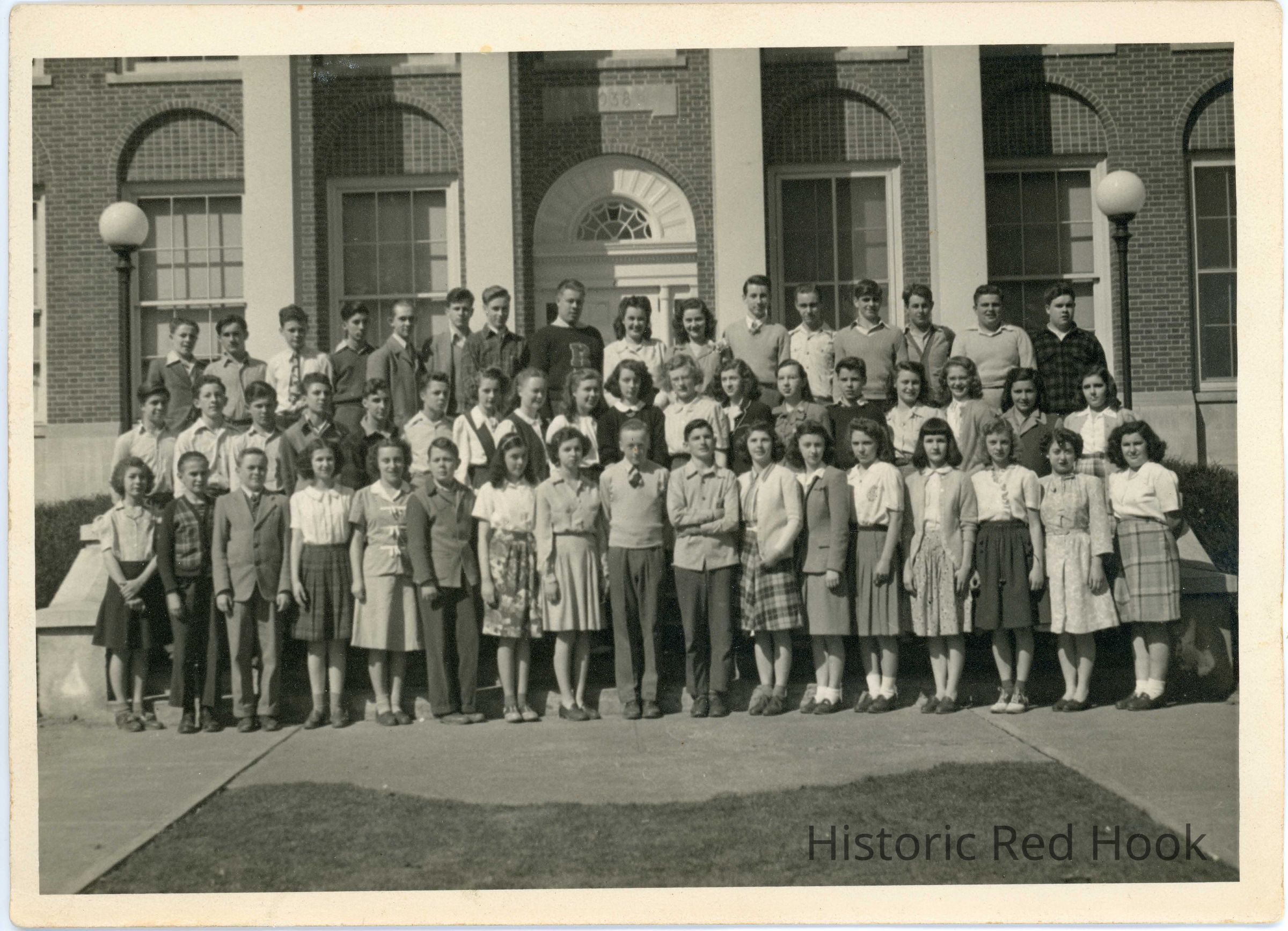 Margaret Riddleburgh Doty's eighth grade class standing in front of Red Hook Central School. Margaret is in the 2nd row, 8th from left).