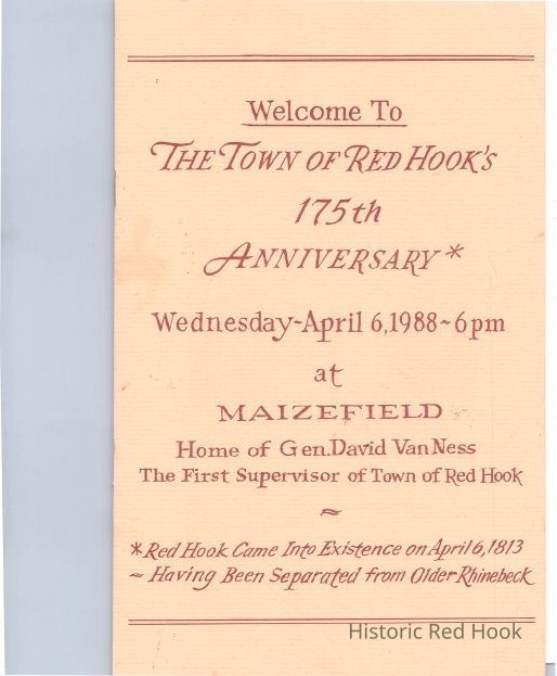 This booklet and flyer were produced for the 175th Anniversary of Maizefield held on April 6, 1988. The booklet contains a brief history of Maizefield written by Clare O'Neill Carr, a copy of an 1815 map of the Town of Red Hook, an article about David Van Ness, an opinion article from the Gazette Advertiser and an insert with the sheet music of "America The Beautiful" .Collection