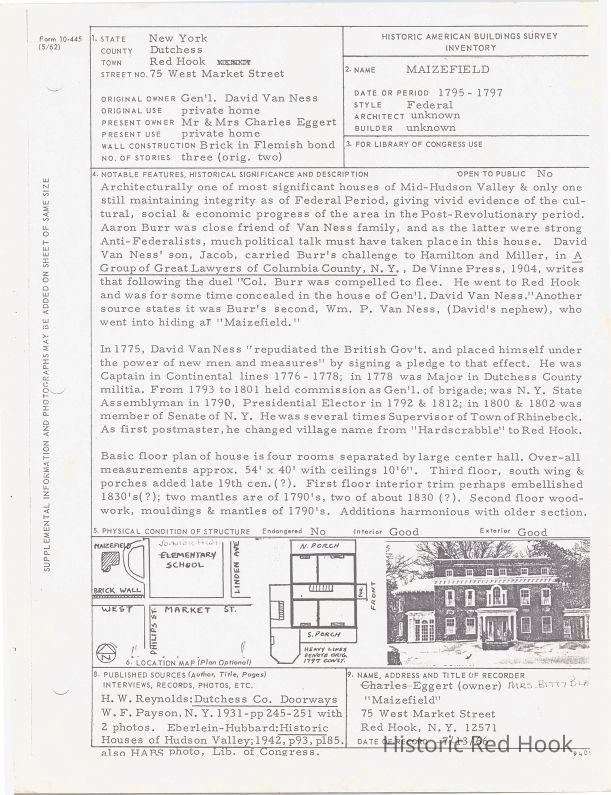 The Historic American Building Survey Inventory for Maizefield containing a general description, its historical significance and information on its notable features recorded on July 13, 1966.Collection