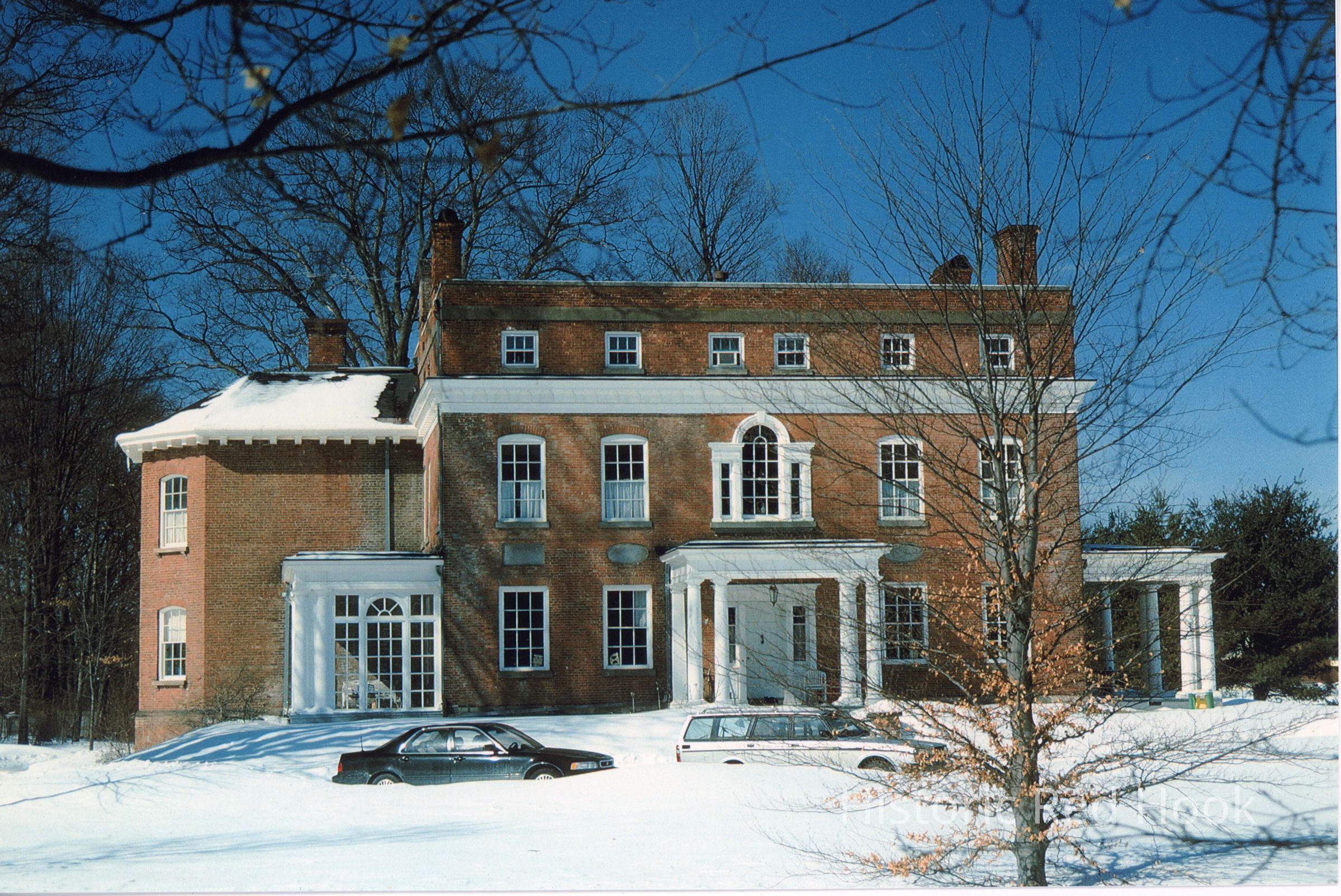 Maizeland. Caption from "Brief History of Red Hook" reads 'Maizefield: When he moved from Upper Red Hook to the lower village around 1795, David Van Ness built his house with a commanding western view, "beneath the mountains" as he ever referred to his home. With its fine Palladian window and geometric motifs, the Georgian-Federal house is considered one of the finest examples of post-Revolutionary war construction.Photograph Details