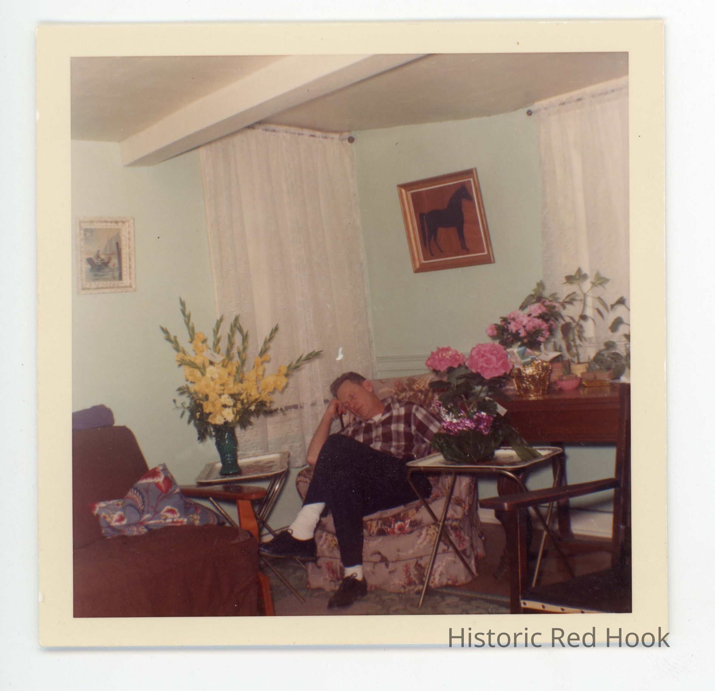 Color print, Man slumped in chair. "Jean Coons (sp?) and Louise Breazzano" written on back. "May 1965" stamped on back.Photograph Details