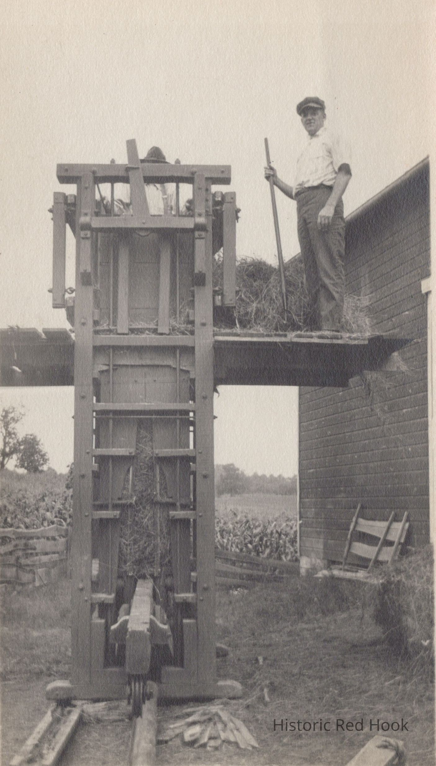 Photo of man standing on a platform next to early hay baling machine.