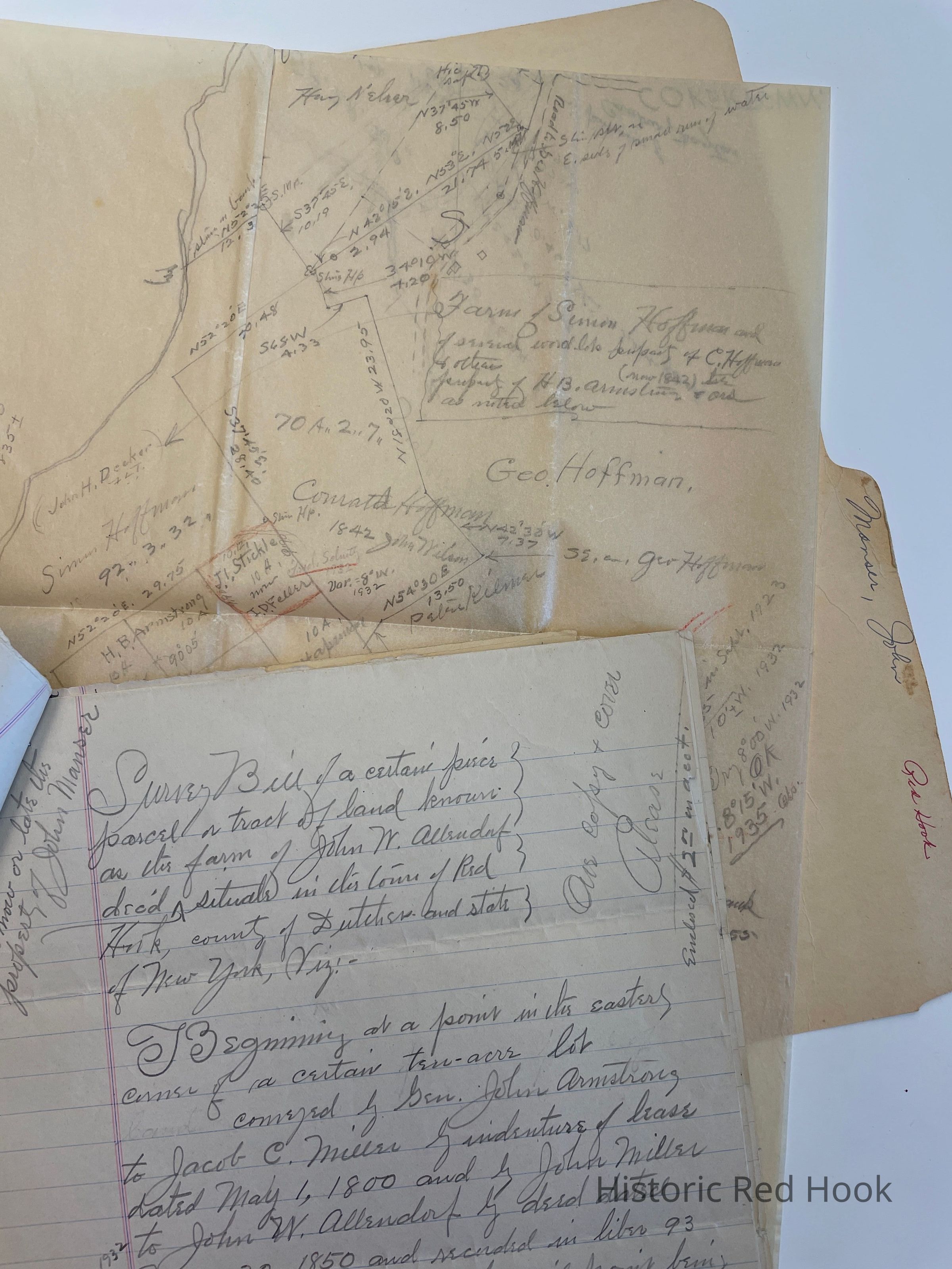Field Notes & Survey: Sept 1923 Tract of land known as farm of John W. Allendorf, dec’d now property of John Manser. 31.05 acres. Mentions: Beg. E corner of 10 acre lot from Gen John Armstrong to Jacob C. Miller, lease 1 May 1800 and by John Miller to John W. Allendorf 30 May 1850 93:20, being SE line of Peter Schuyler Patent, along woodland from James Adams to Peter H., Allendorf in 1856, now property of Anthony Orlich, then along land formerly leased by Armstrong to Simon Hoffman, late property of John H. Decker, dec’d and now Anthony Orlich, along NE line of farm from James Adams to Peter H. Allendorf in 1856, late prop. Of Louis E. Warren, now property of Anthony Orlich to E corner of 13 acre wood lot known as Armstrong Swamp to E line of Frank I. Whitnall [ Notes above are from Field Book of Surveys of lands of Gen. John Armstrong filed in County Clerk’s Office in Dutchess.] Due E to the farm conveyed by Arthur Phillips to Philip Hapeman and late the property of Silas Best, dec’d.
