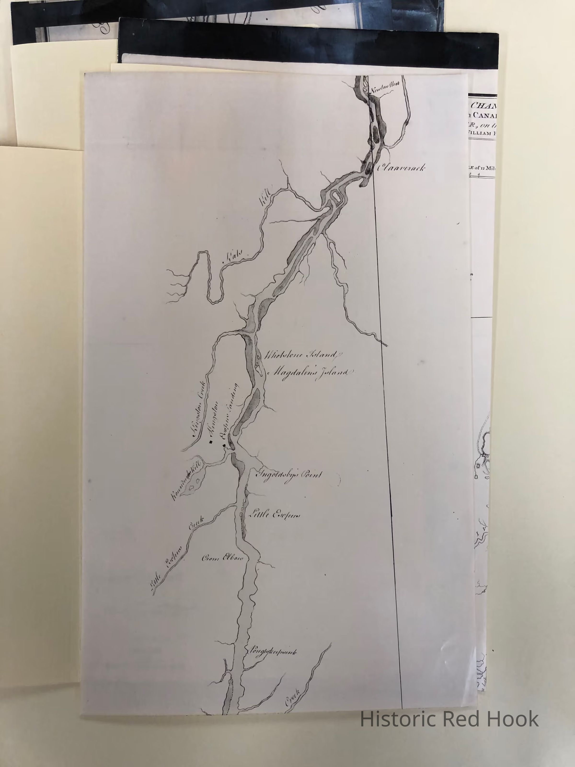 Photostat of map of the Hudson River, section from Poughkeepsie to Claverack, possibly by Joshua Loring. Magdalen's Island if marked. 1756?