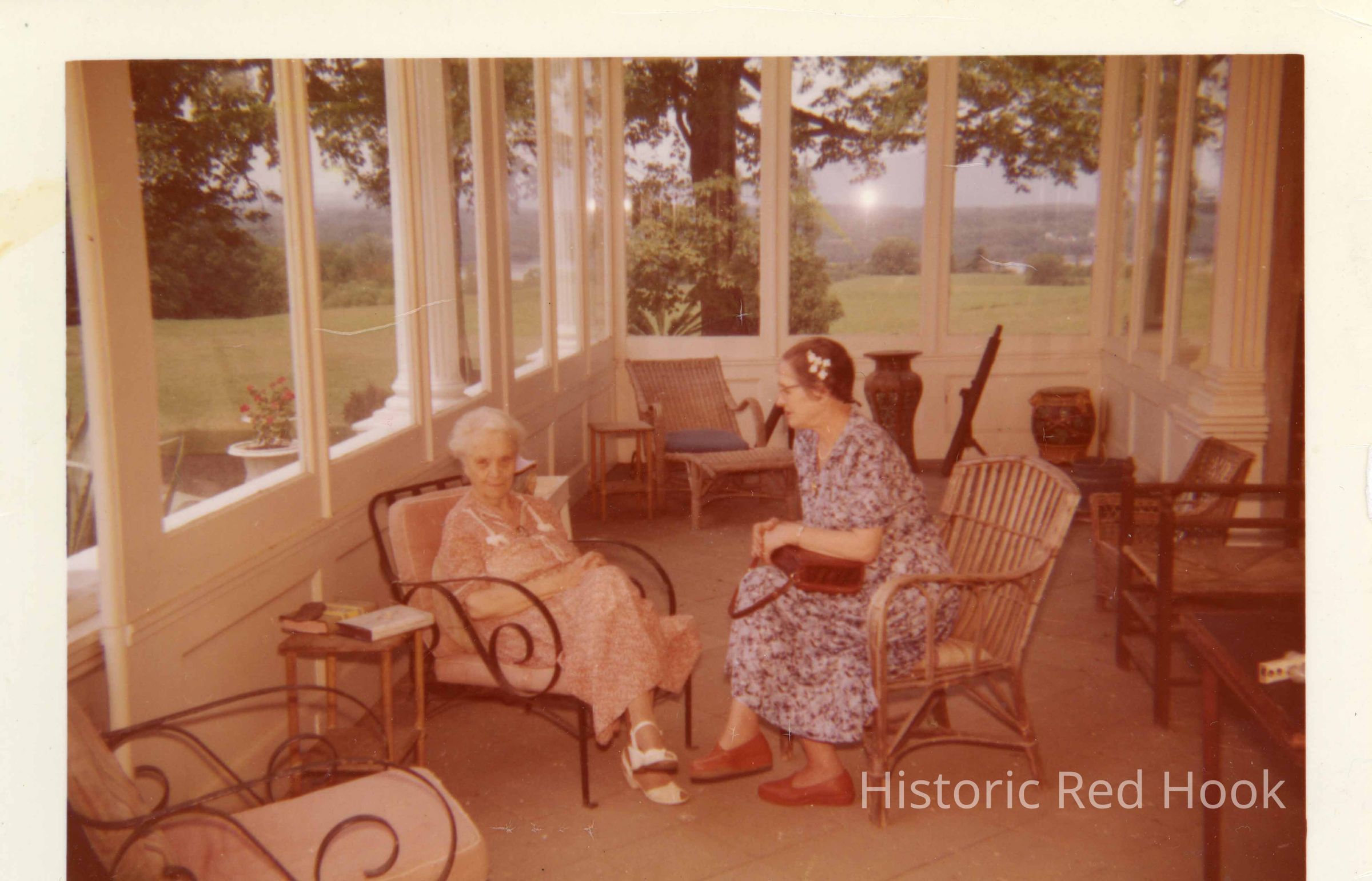 Two ladies sitting on the enclosed porch at Rokeby.