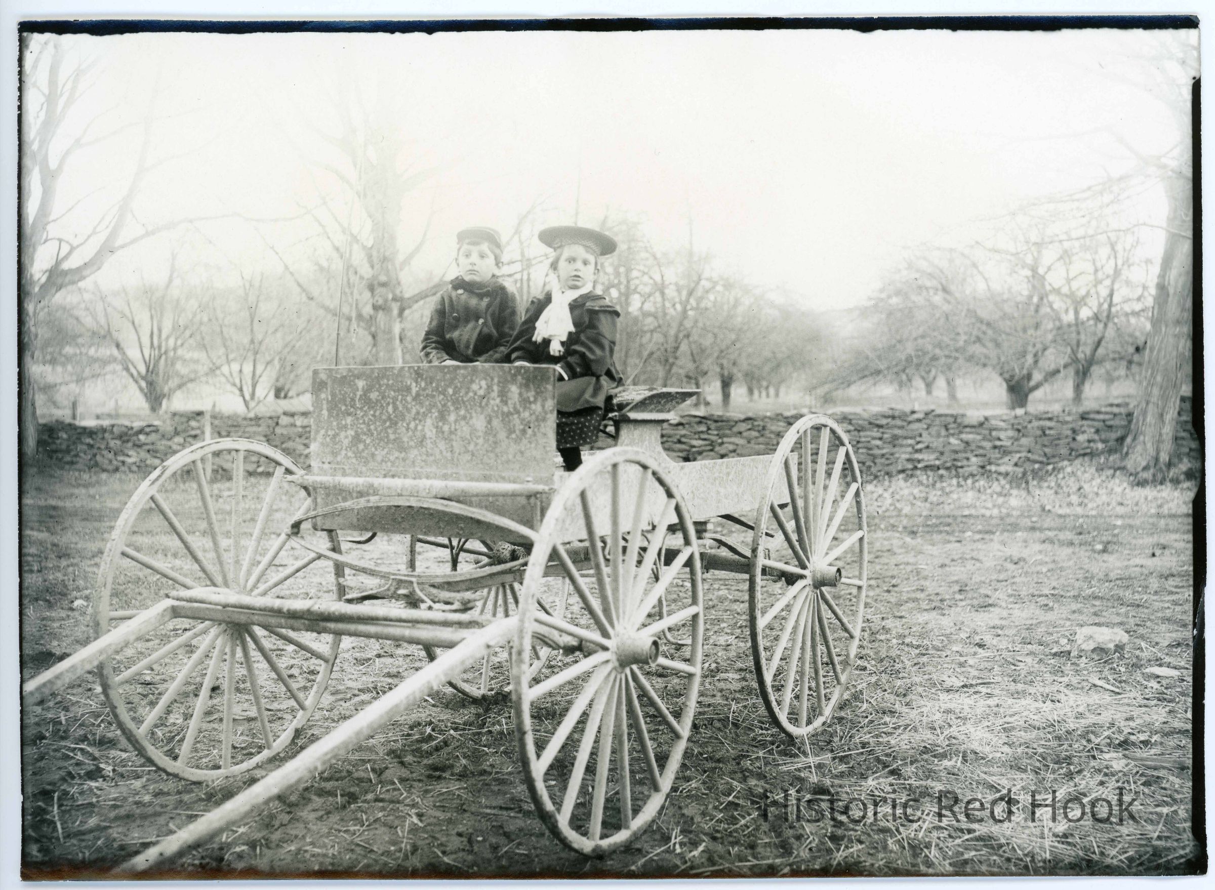 Two young children are seated in a wagon in front of a stone wall near an orchard identified as Marion and Roscoe Teator.Photograph Details